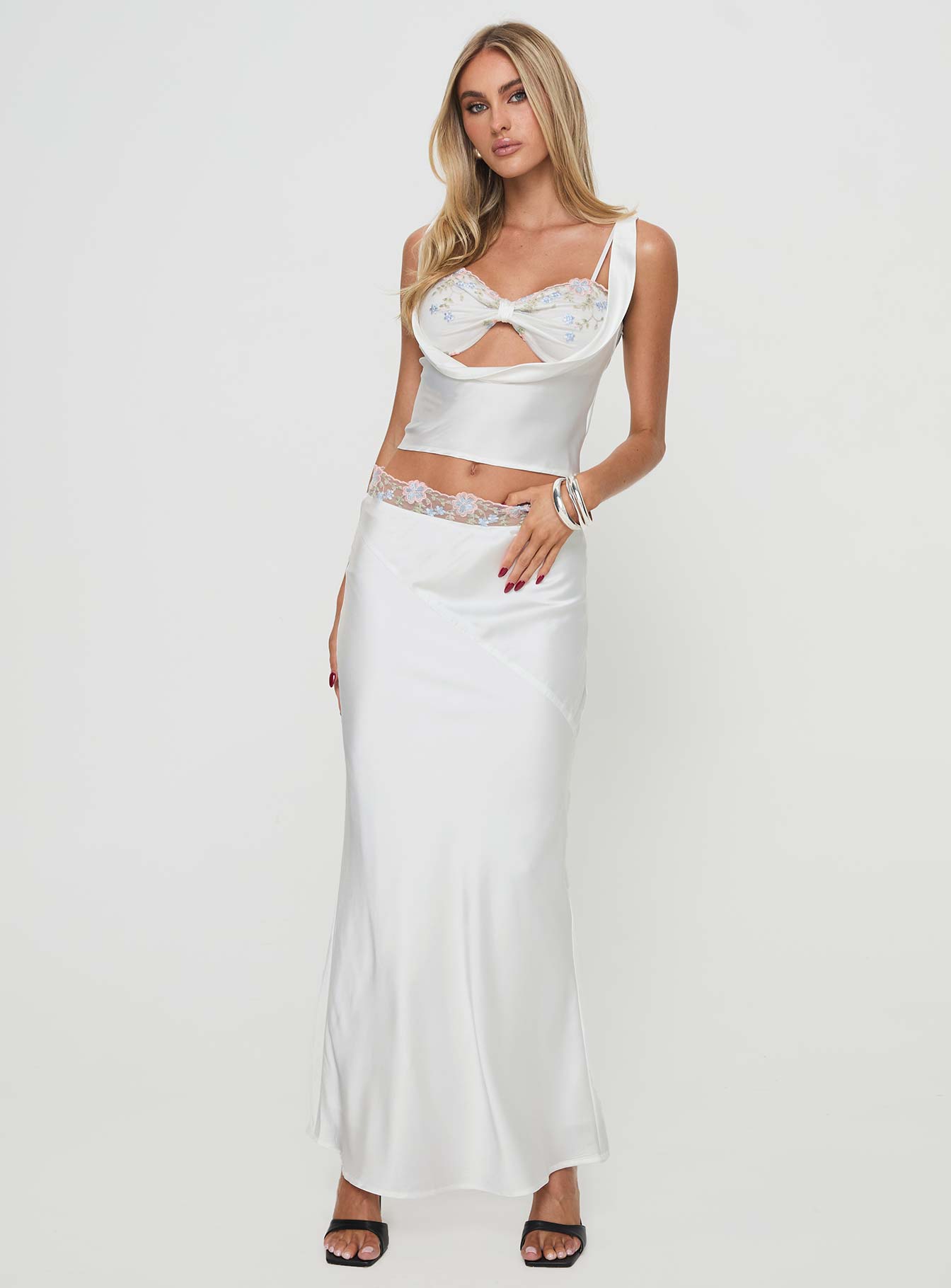 - Silk material look. floral lace detail on bust & waistline. adjustable straps. cowl neckline. invisible zip fastening