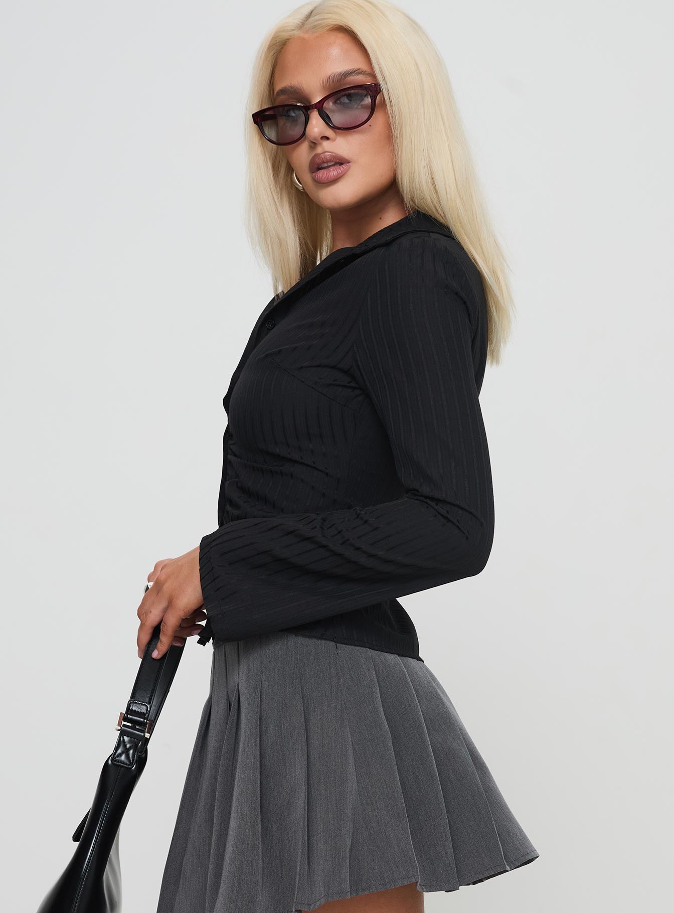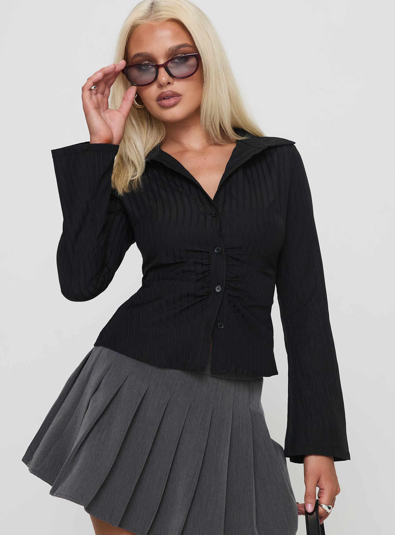 • Classic collar. button-up closure. ruched waist. flared sleeves