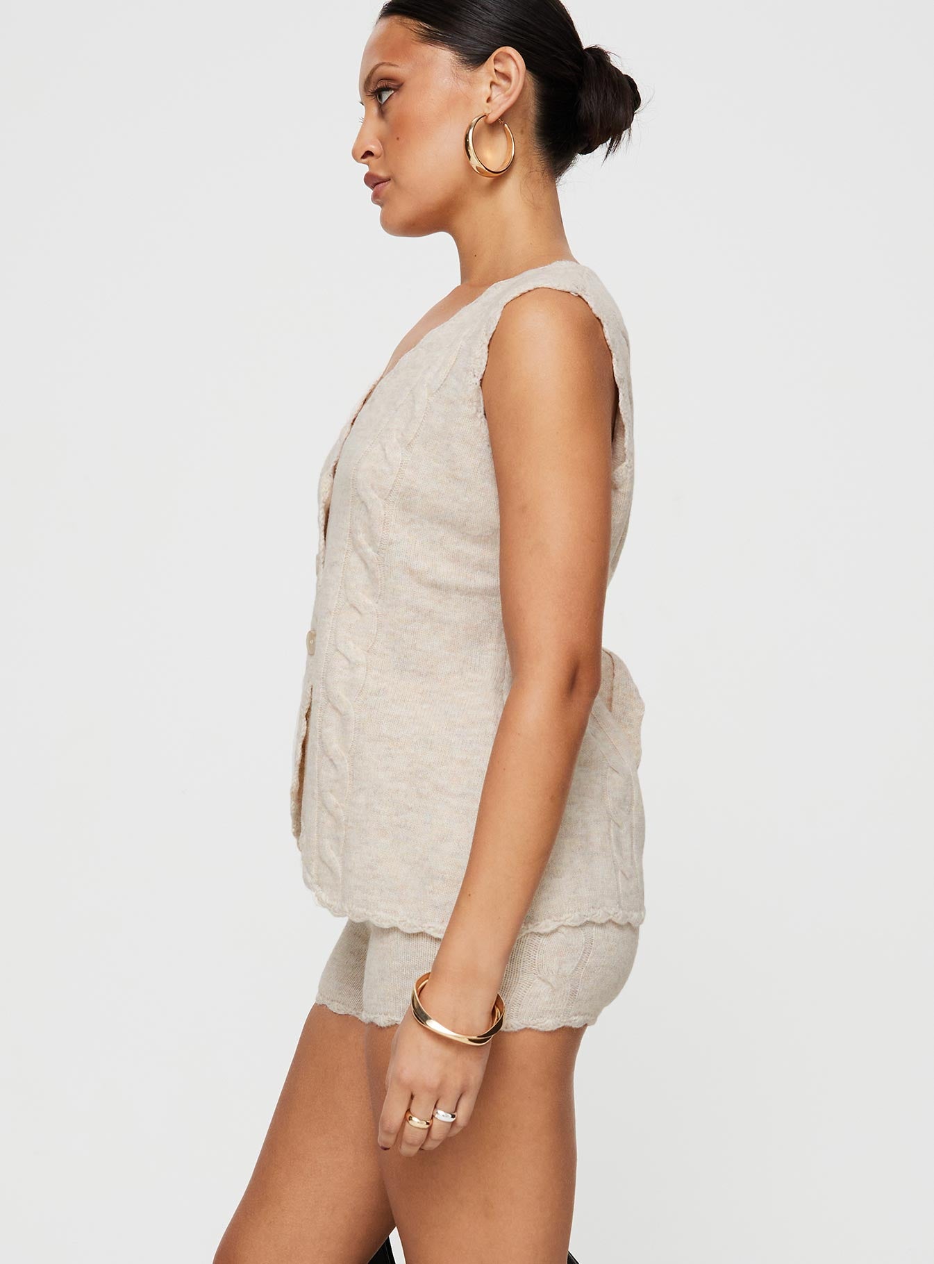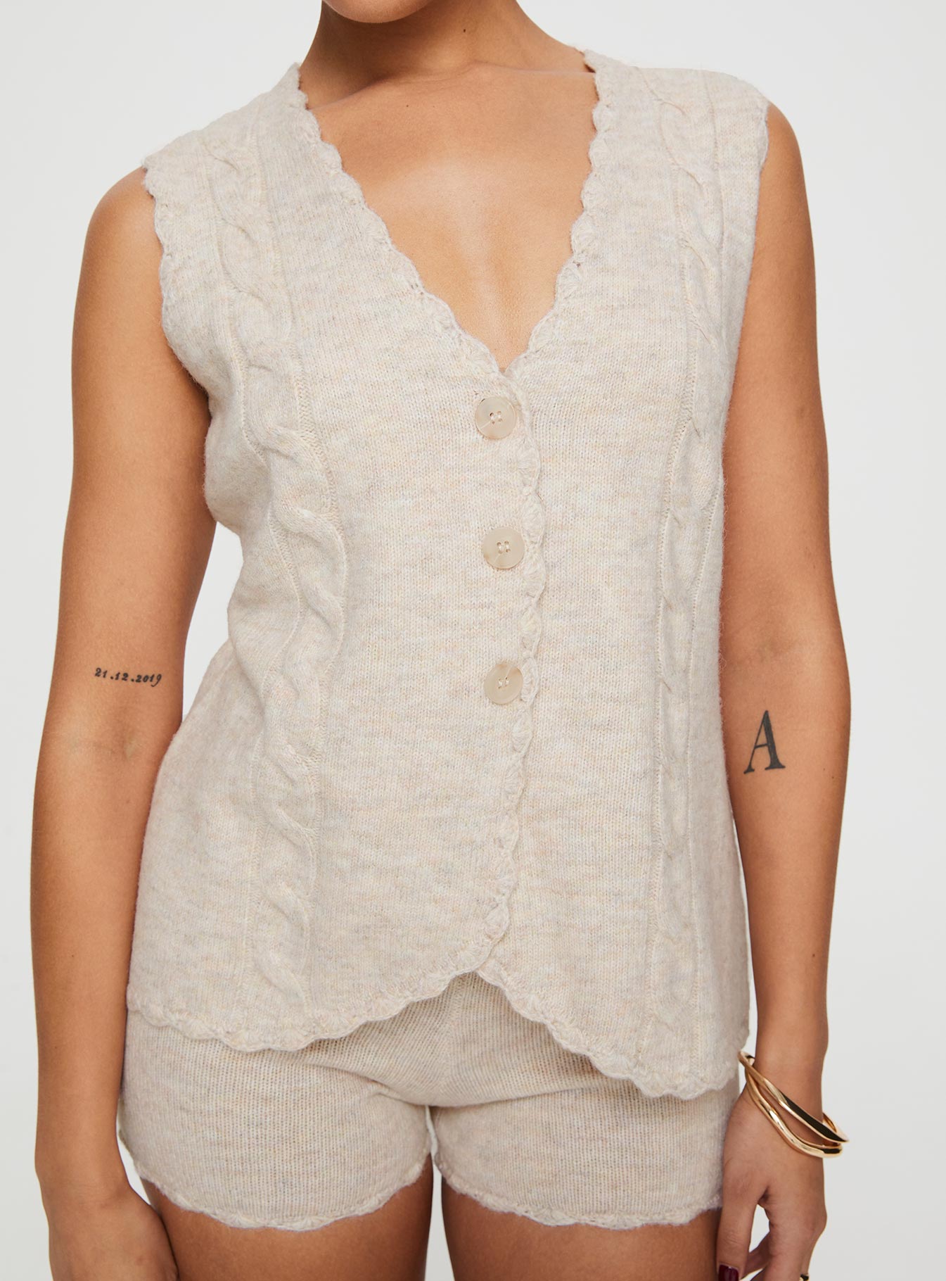 - Knit material. lettuce edge hem. button fastening at front. elasticated waistband