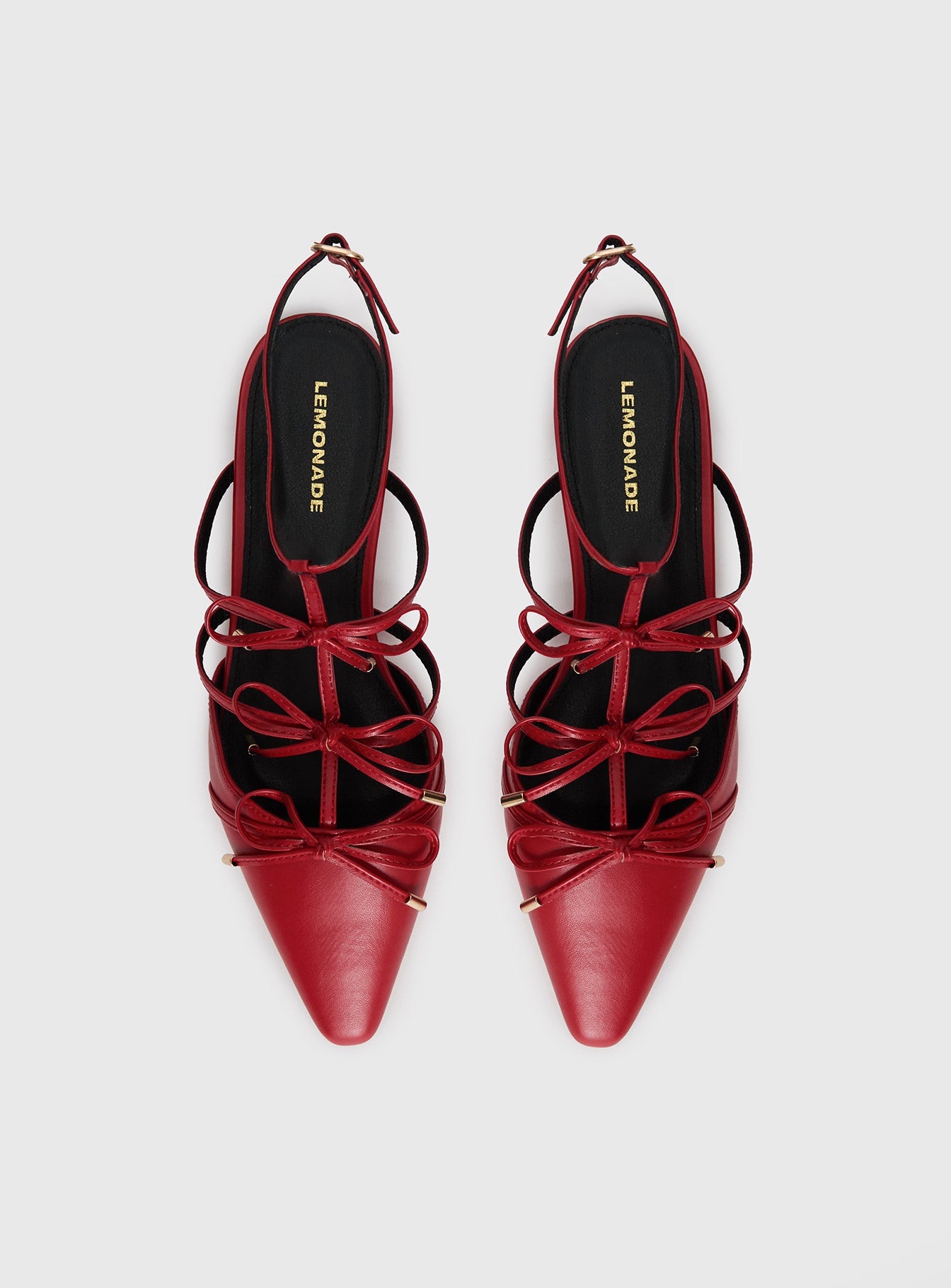 - Faux leather. ankle clasp. gold hardware. bow details along foot. pointed toe