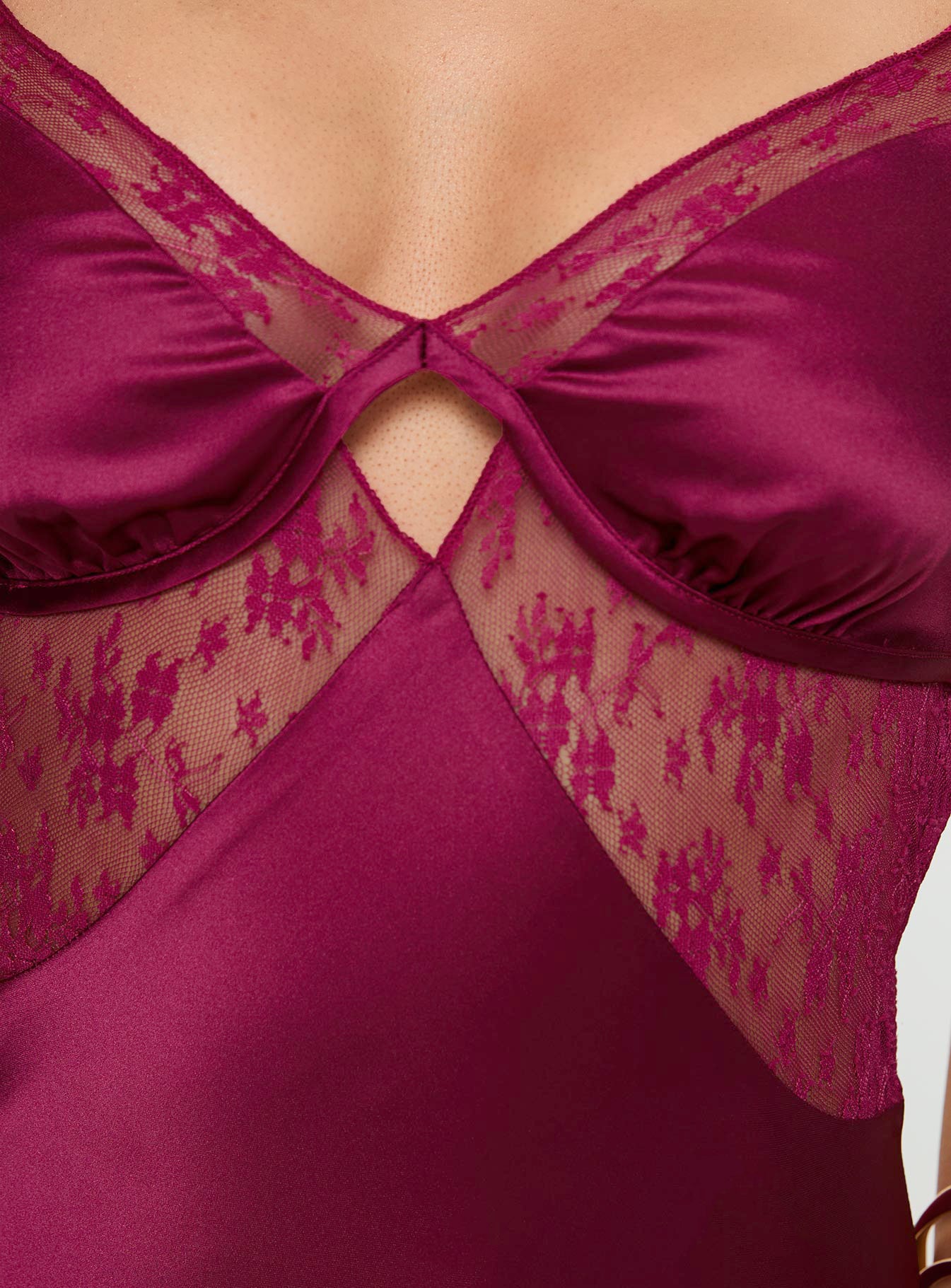 - Silk material look. sheer lace detail. cut out back. adjustable straps. invisible zip fastening