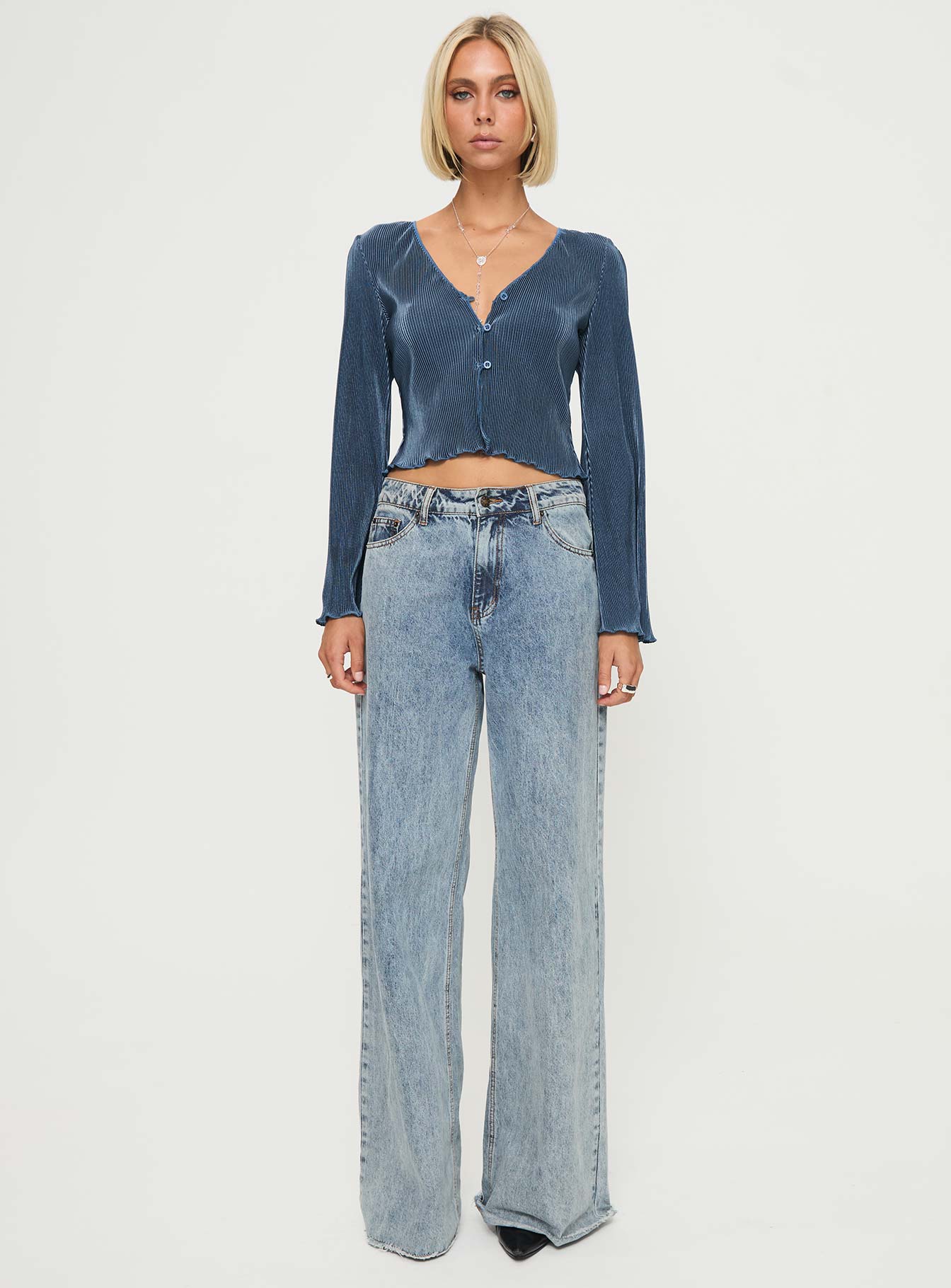 - Plisse material. v neckline. flared sleeve. button fastening. split hem