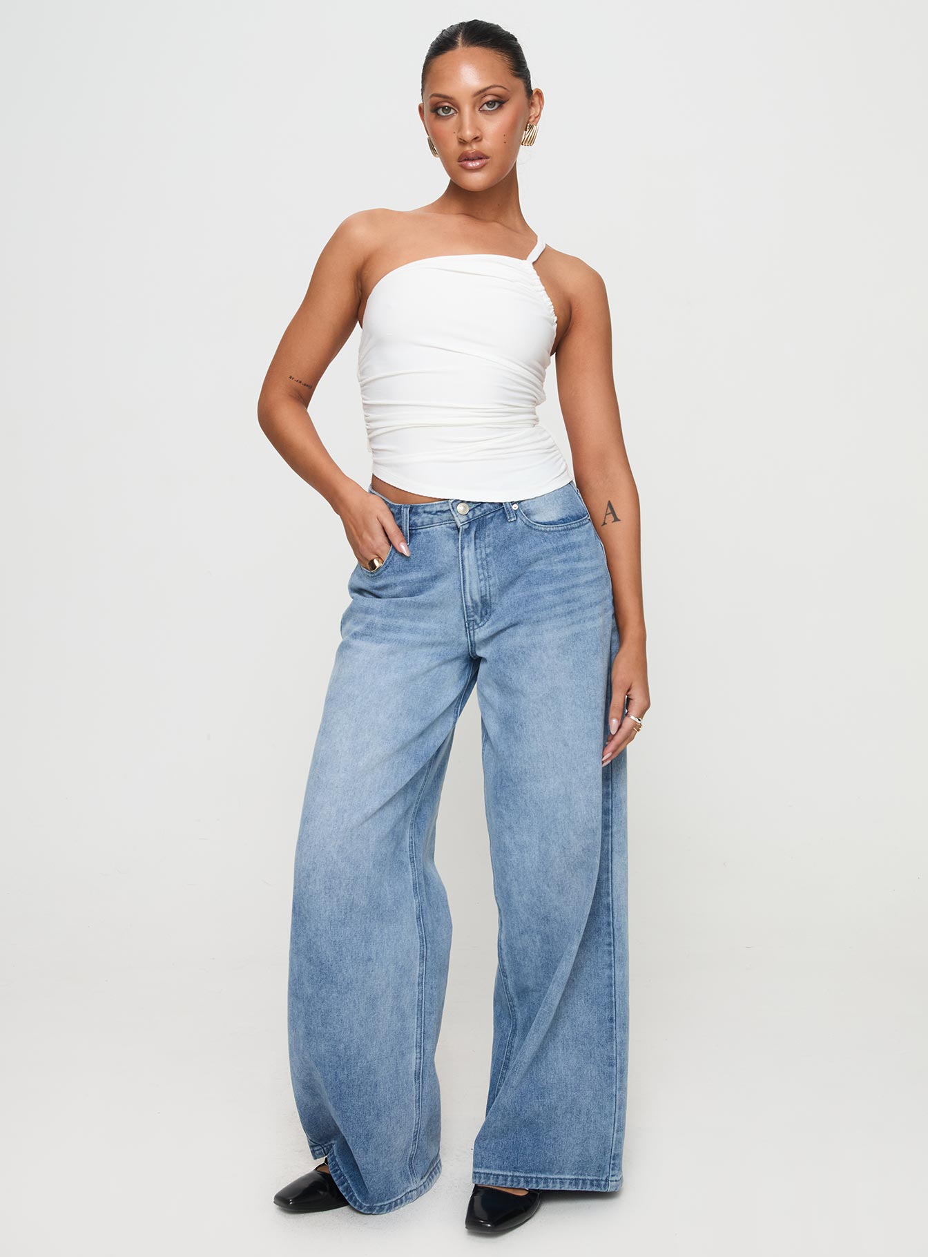 - Halter style. ribbed material. ruching at sides. asymmetric hem. tie fastening