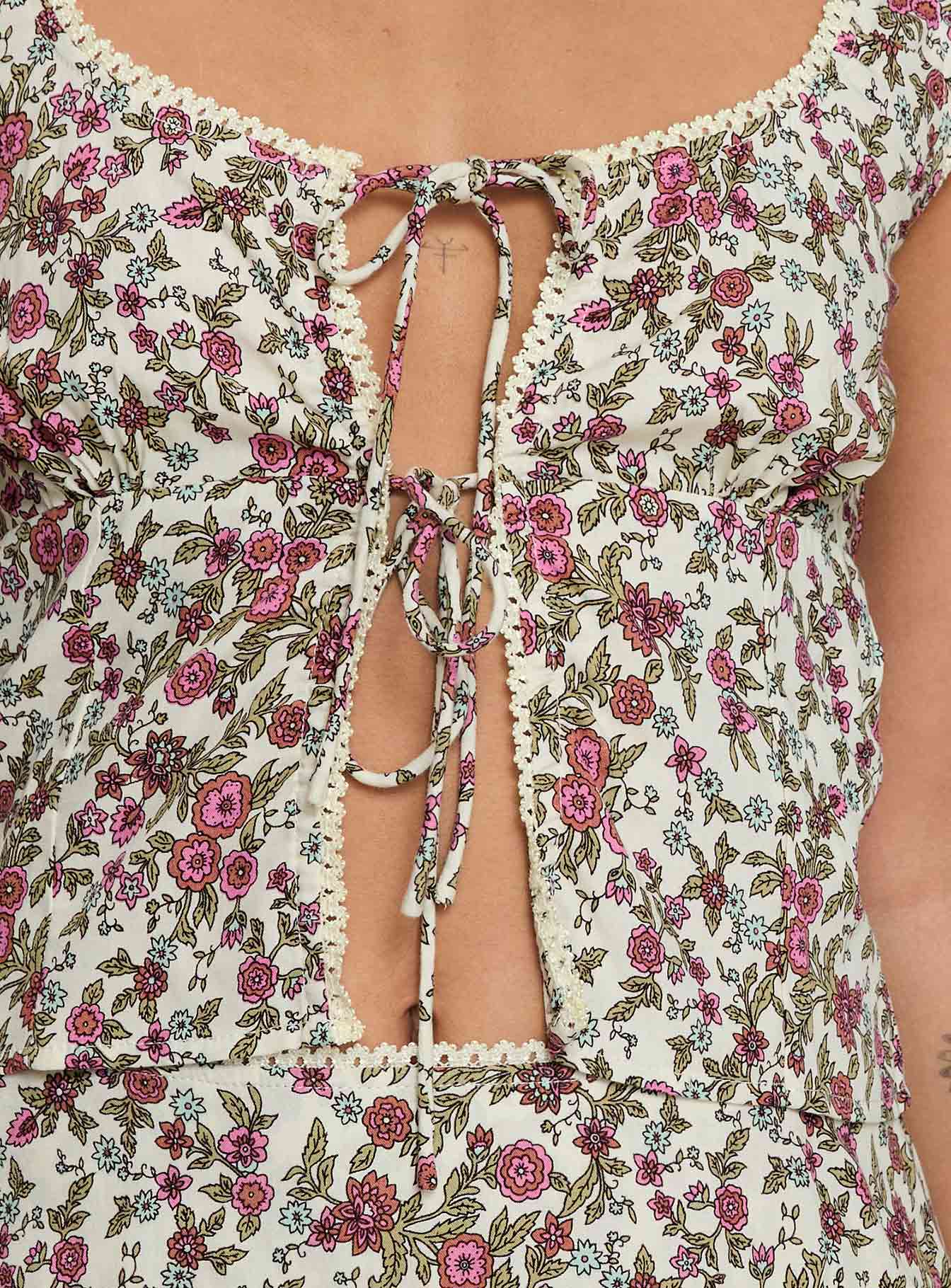 • Fixed shoulder straps. scooped neckline. twin tie fastening at bust. split hem
