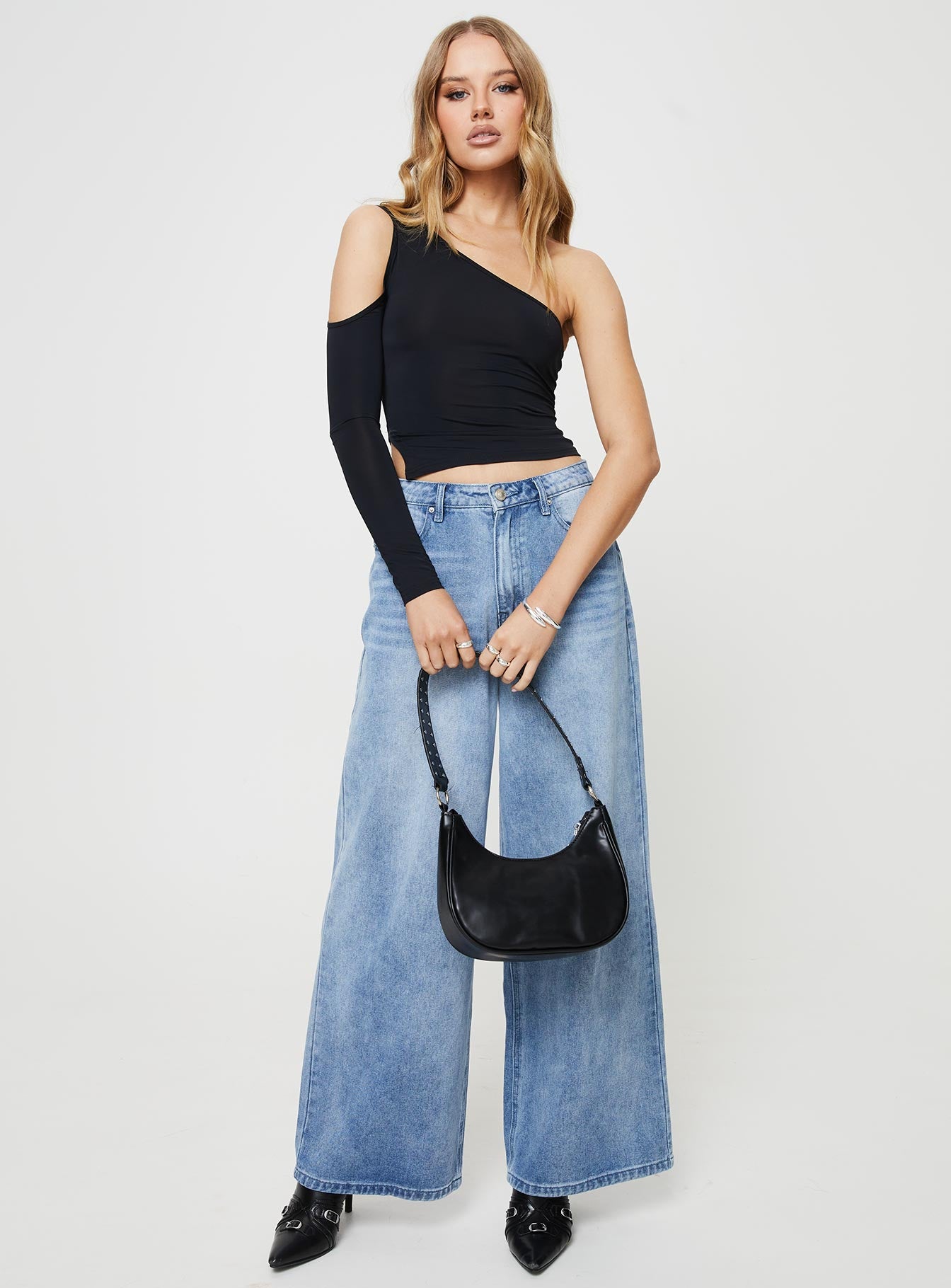 - Slim fitting. one shoulder style. cut out at arm. split hem