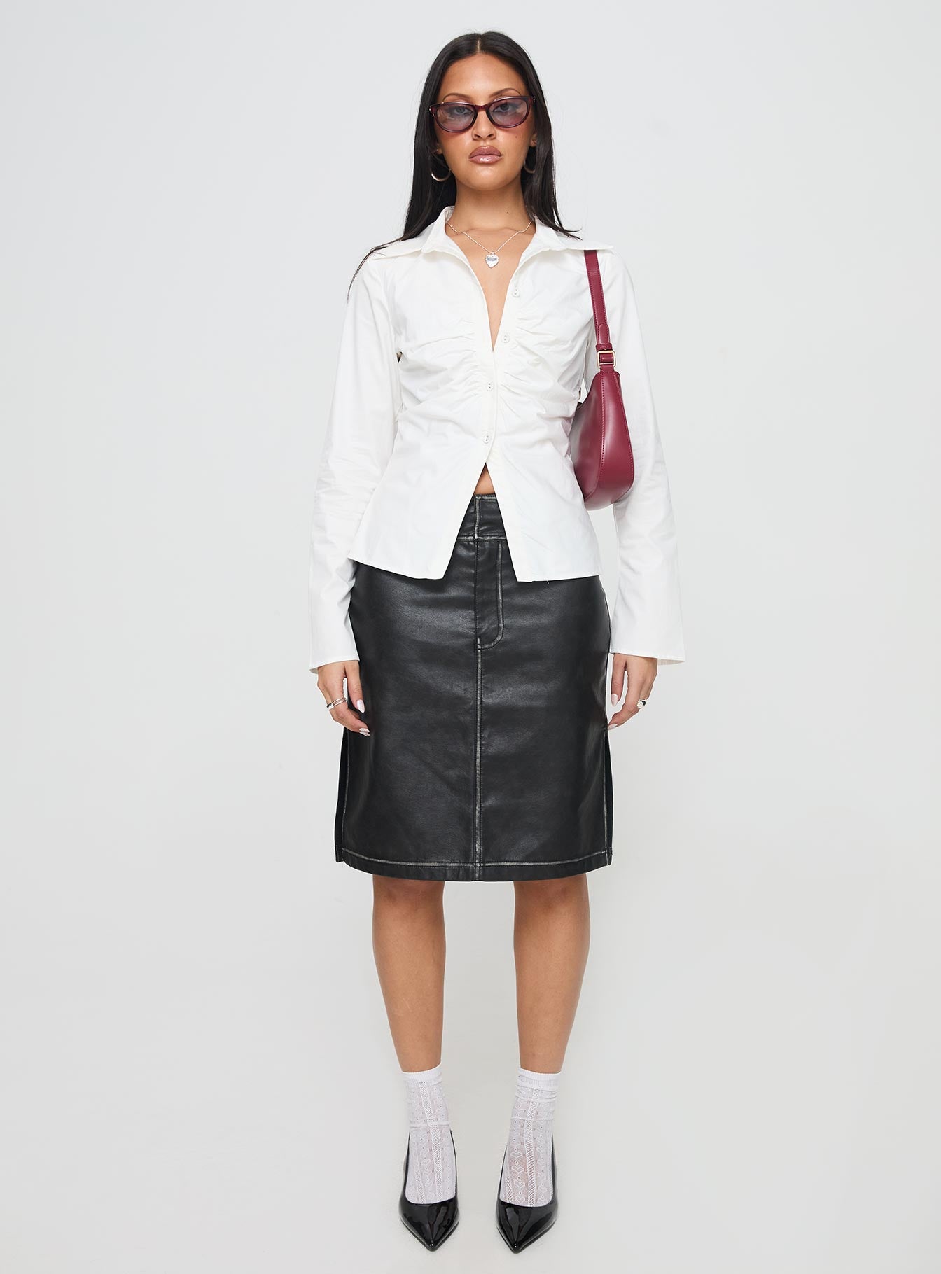 • Classic collar. button-down closure. ruched detailing at front. flare cuffs