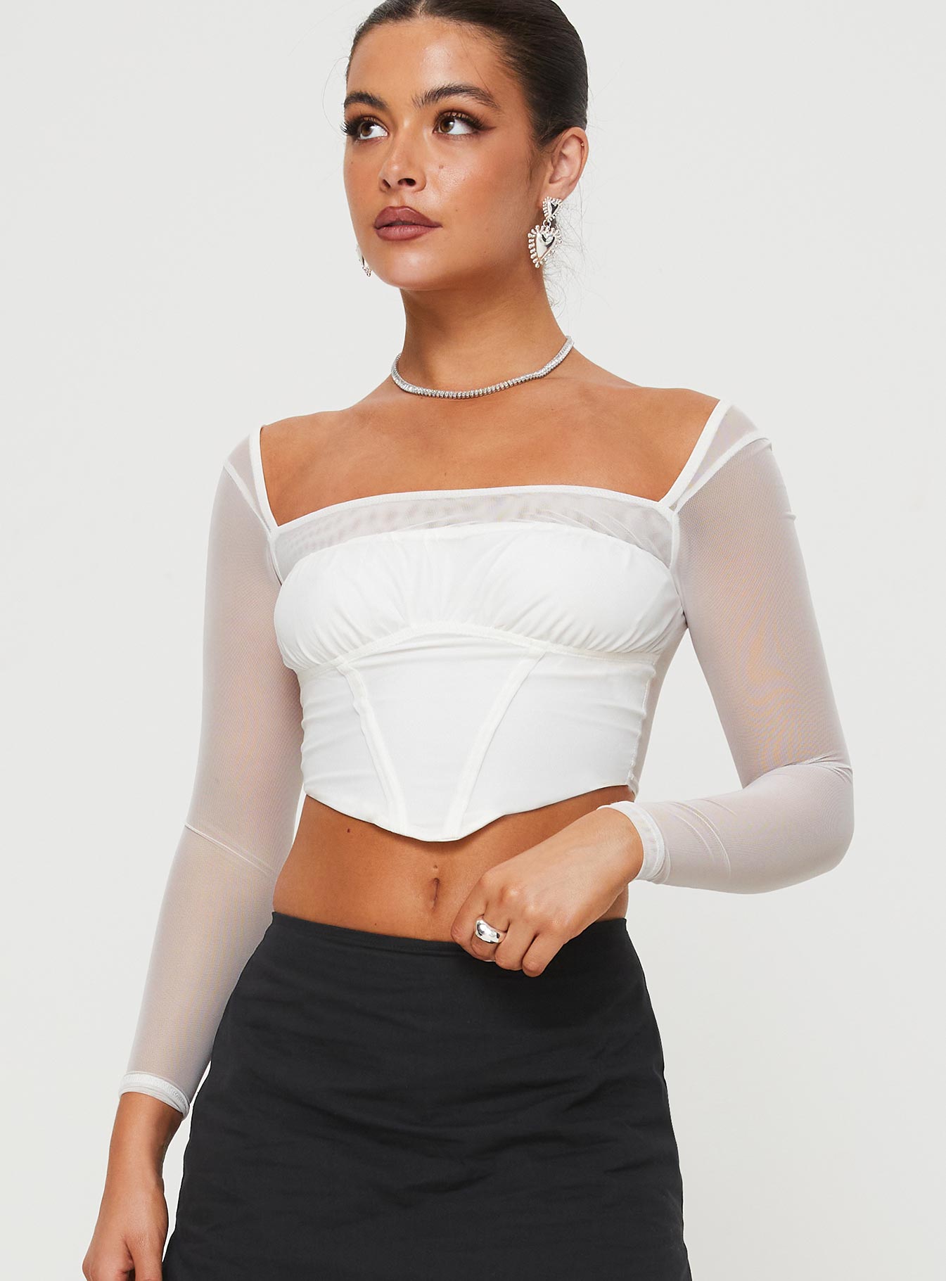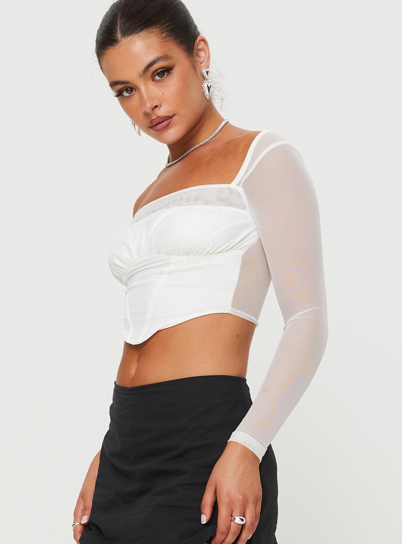 - Square neckline. sheer mesh material. ruched detail at bust?