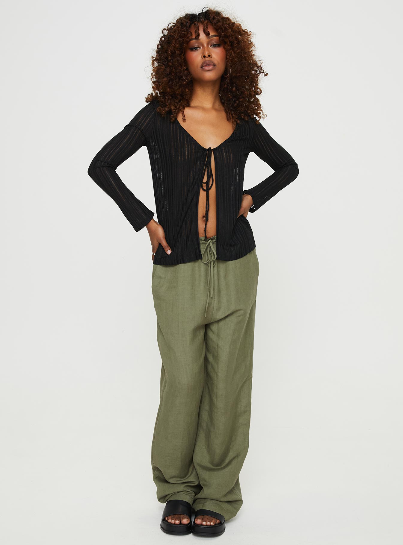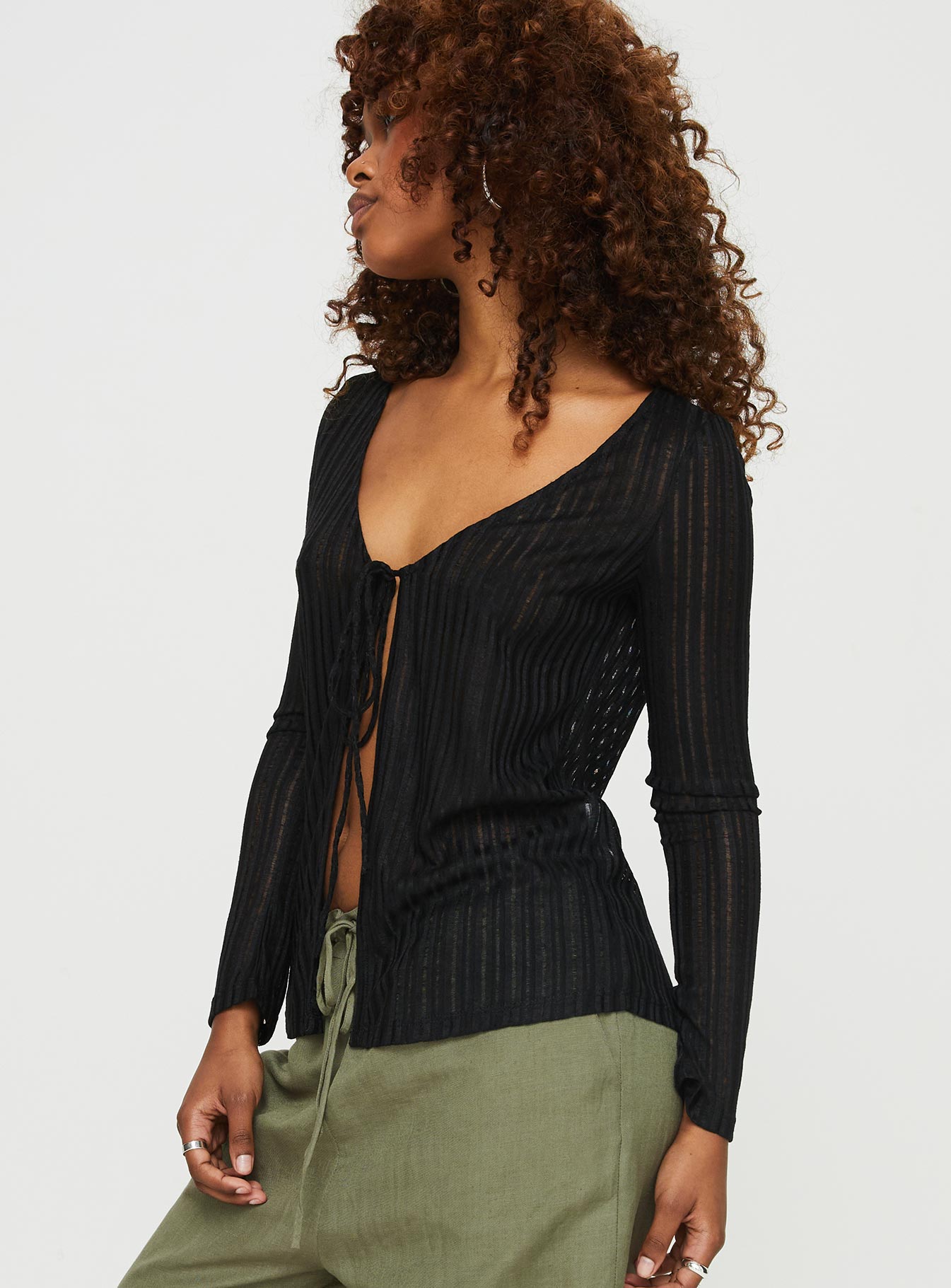 - V-neckline. open front. sheer knit-like material. tie fastening at bust?