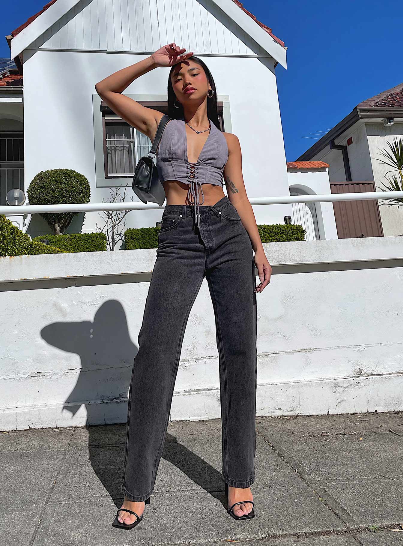- Black washed. belt looped waist. button & zip closure. five pockets