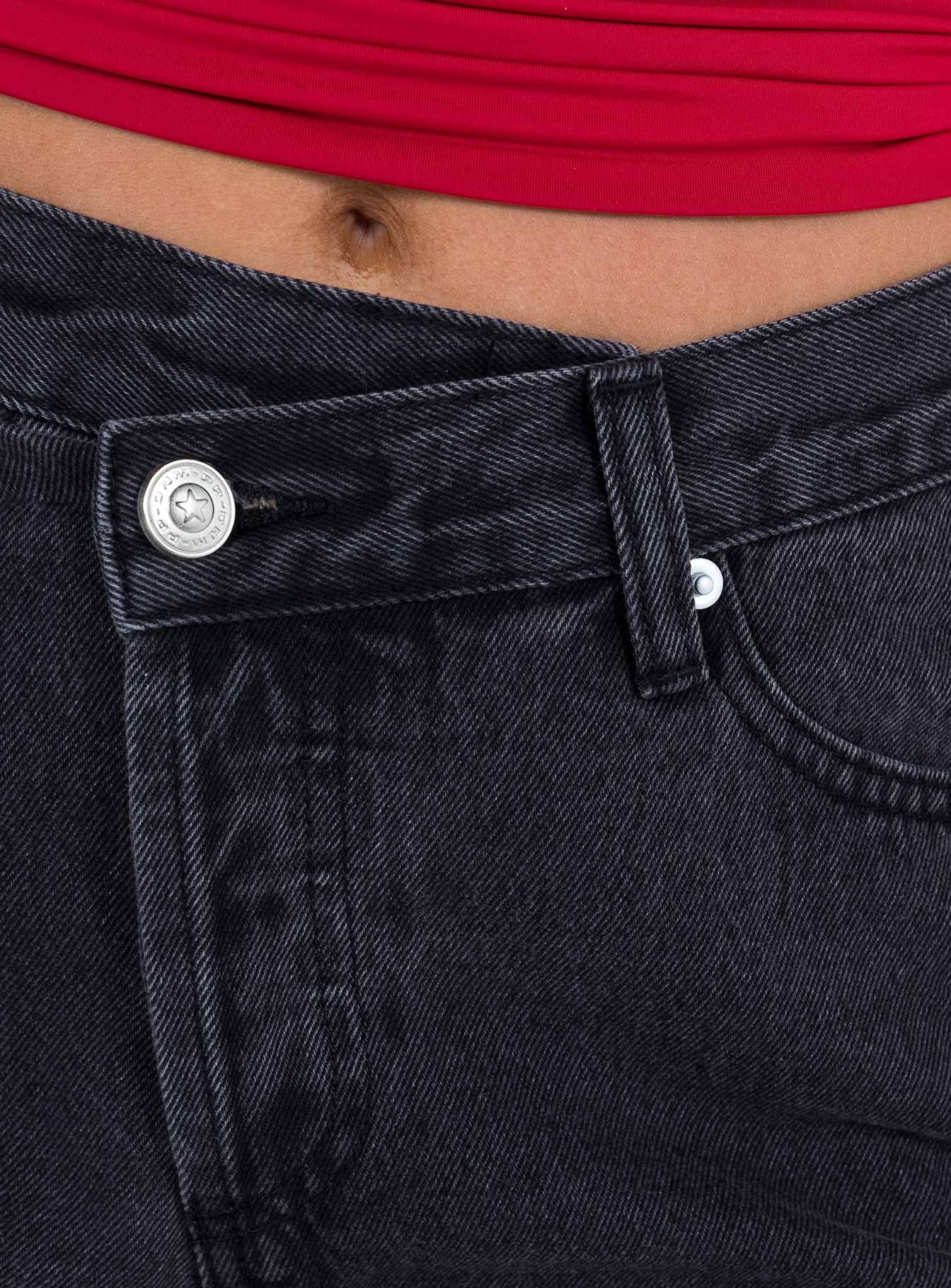 - Black washed. belt looped waist. button & zip closure. five pockets