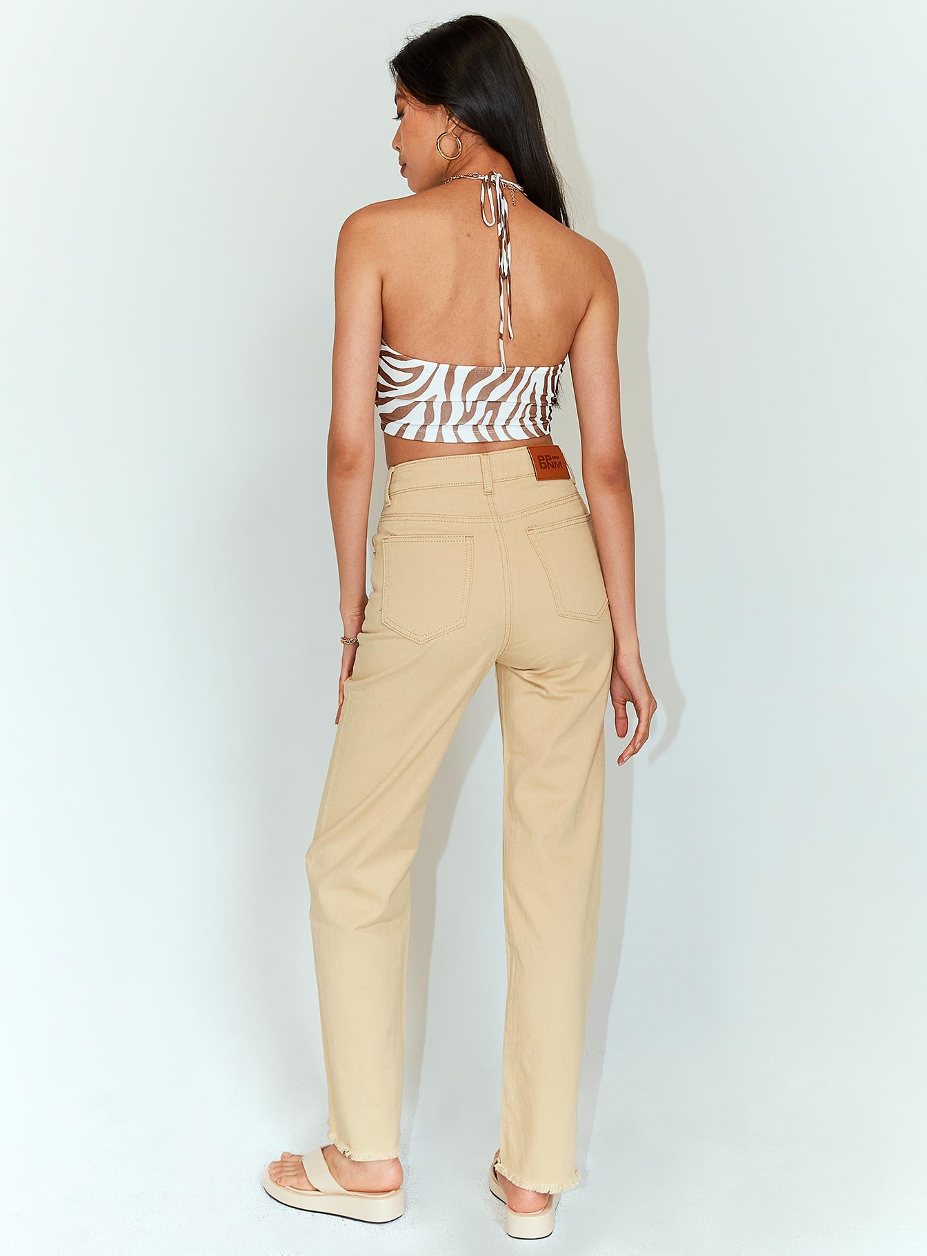 • Beige washed. belt looped waist. button & zip closure. five pockets. raw cut hem. branded patch at back