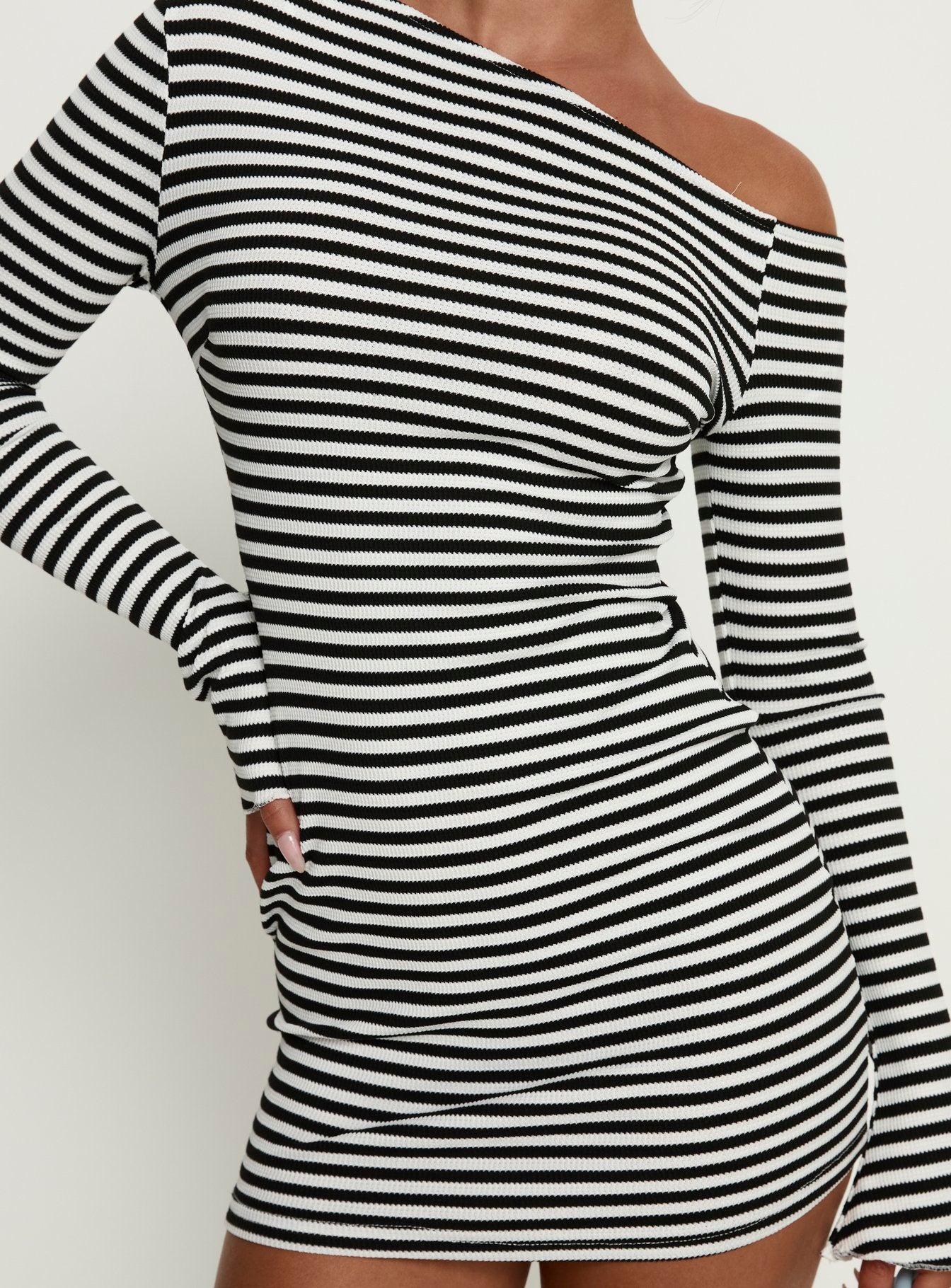 - Long sleeve mini dress in stripe print with off-shoulder neckline