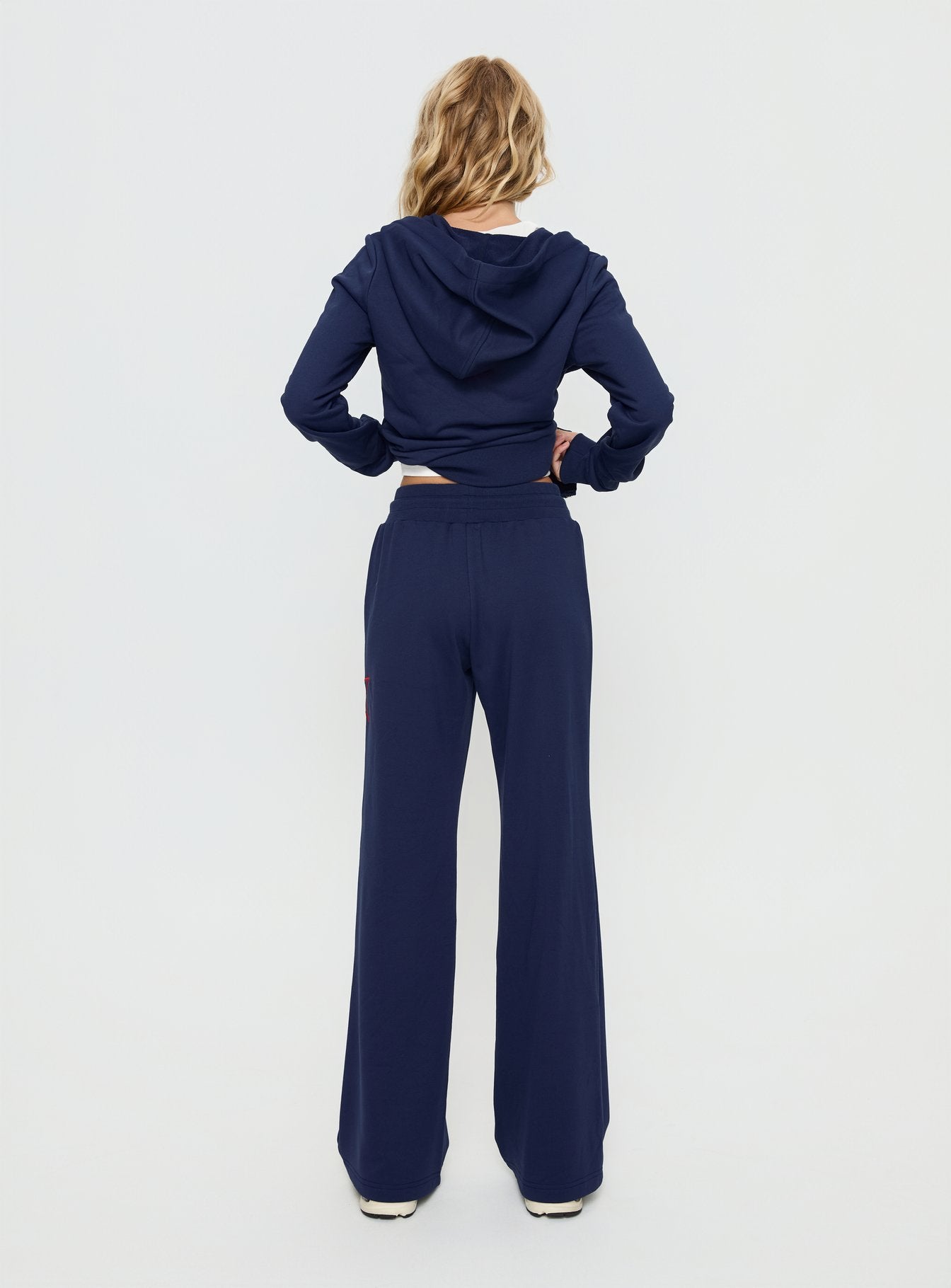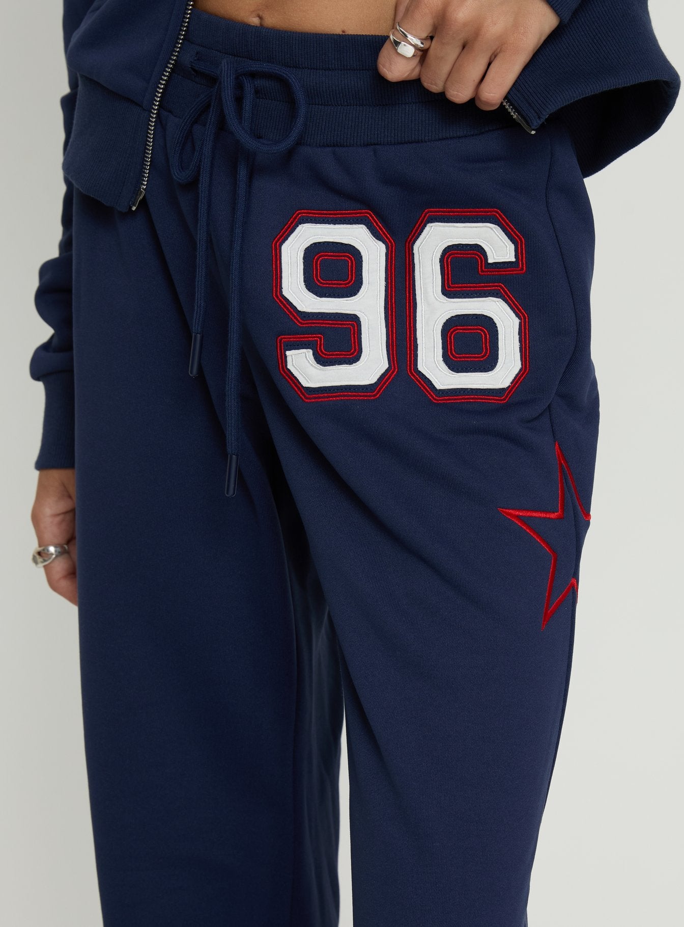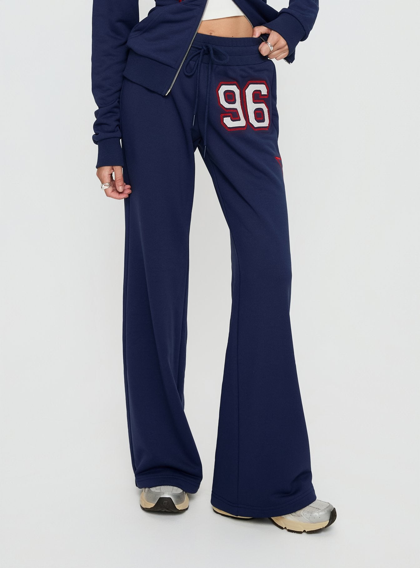 - Track pants with distressed detail & mid-rise fit?