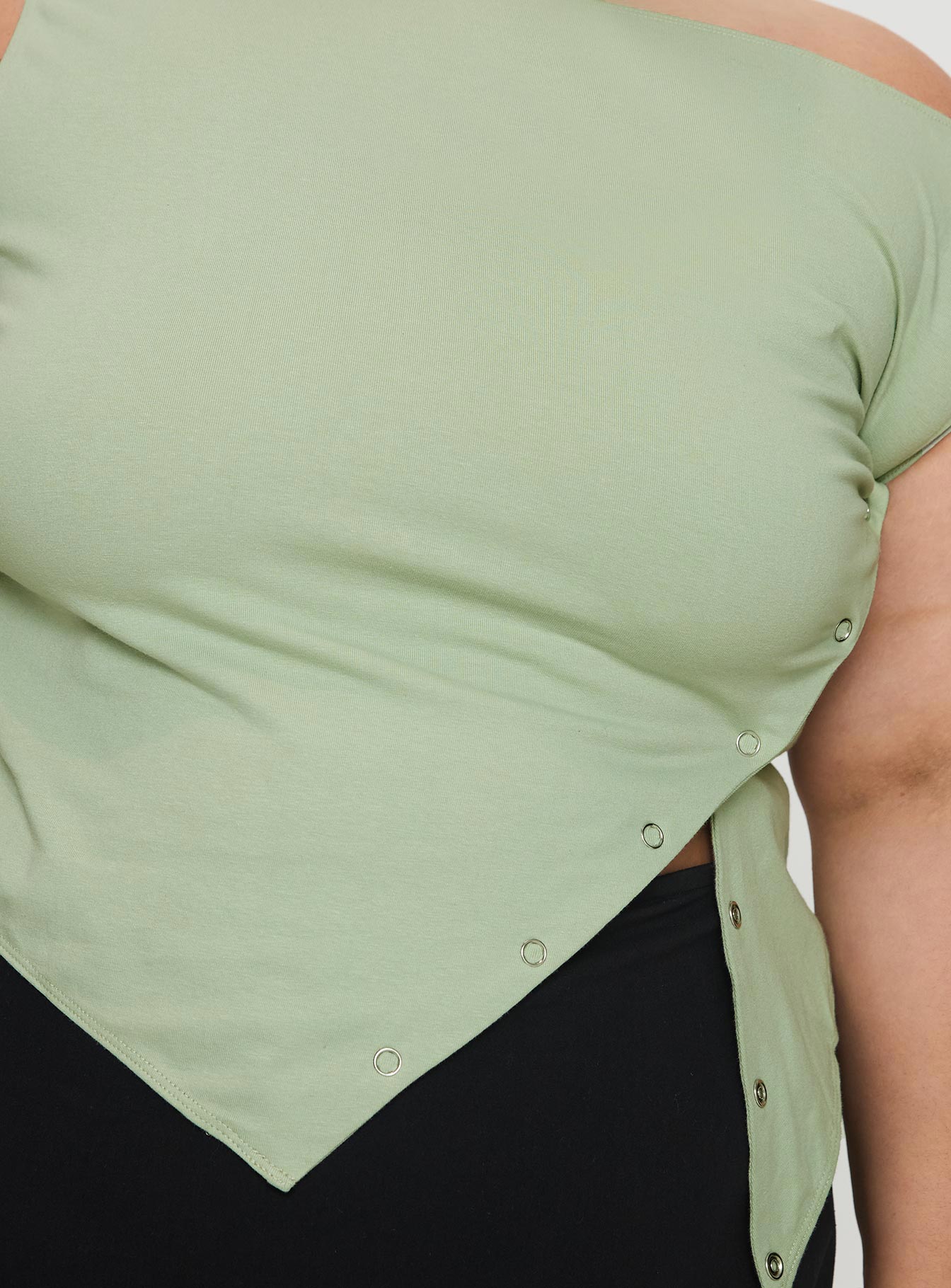 - Diagonal button-up closure. split hem detail. ruched shoulder. cropped?