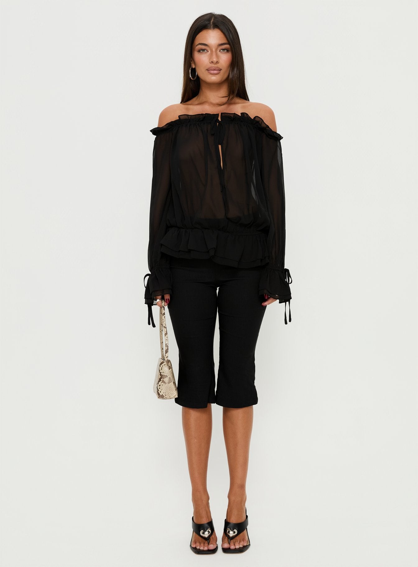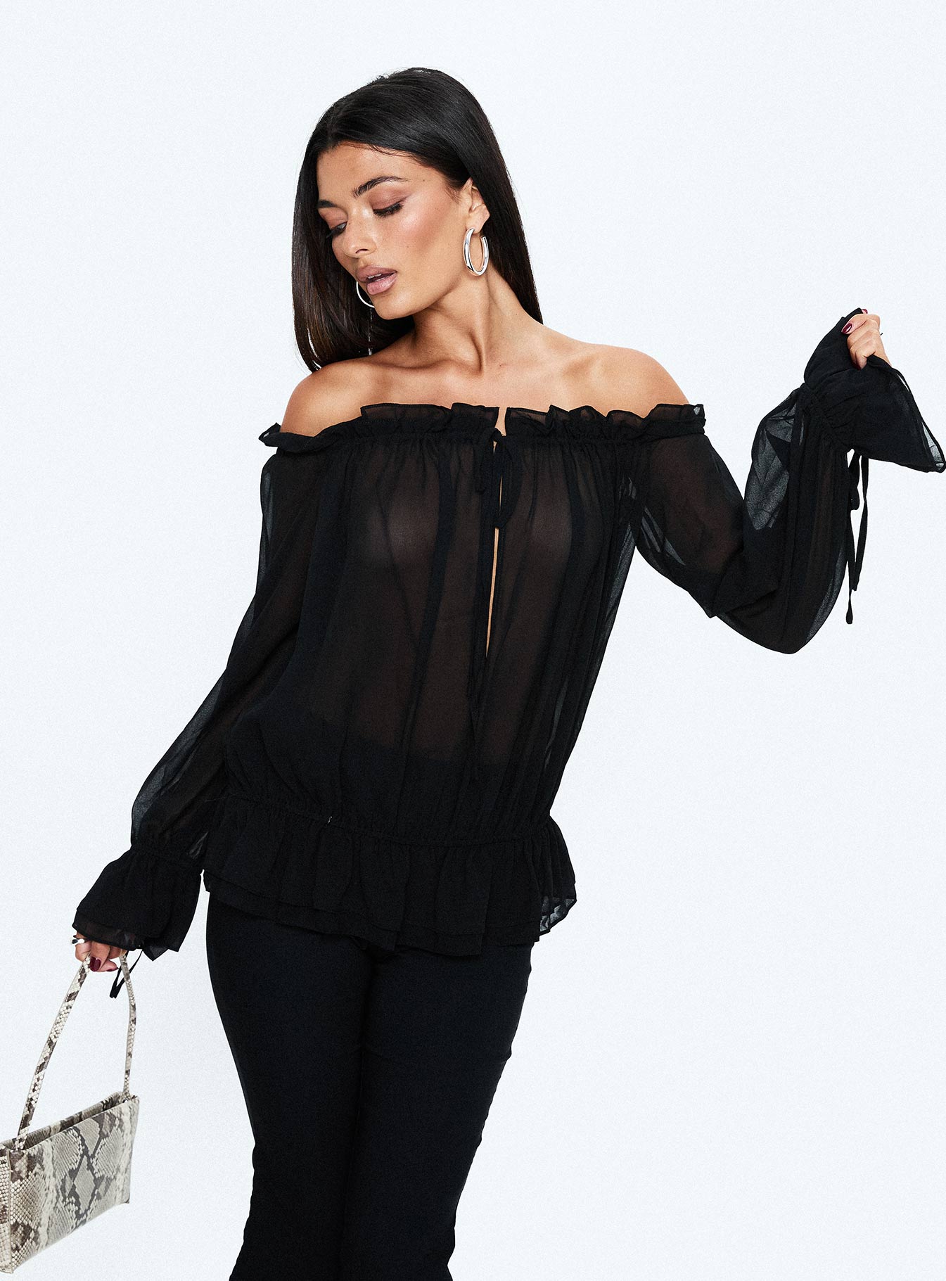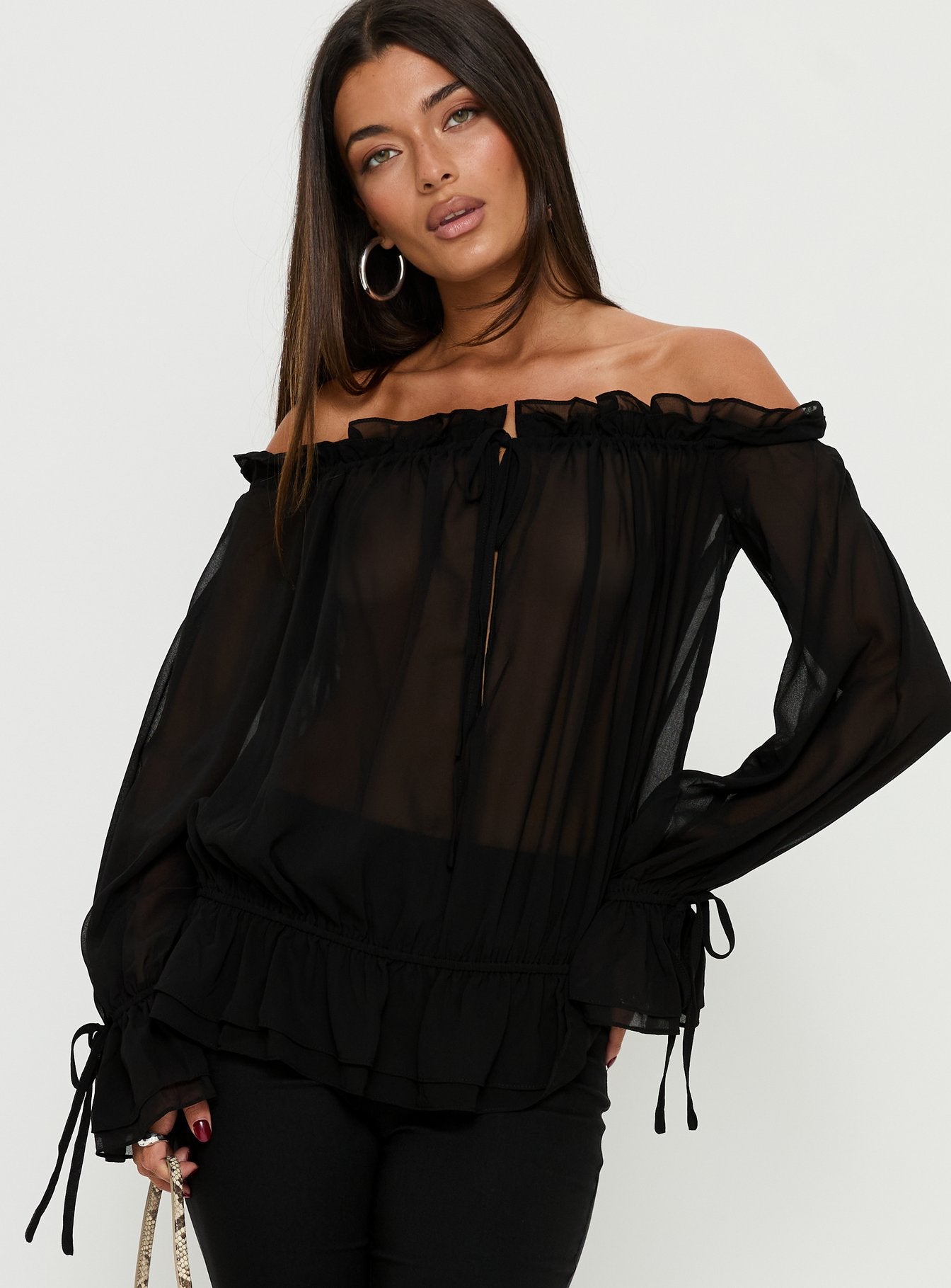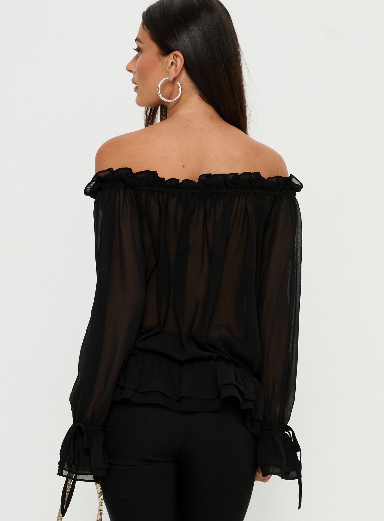 - Woven top with frill detail. an off shoulder neckline & long sleeves