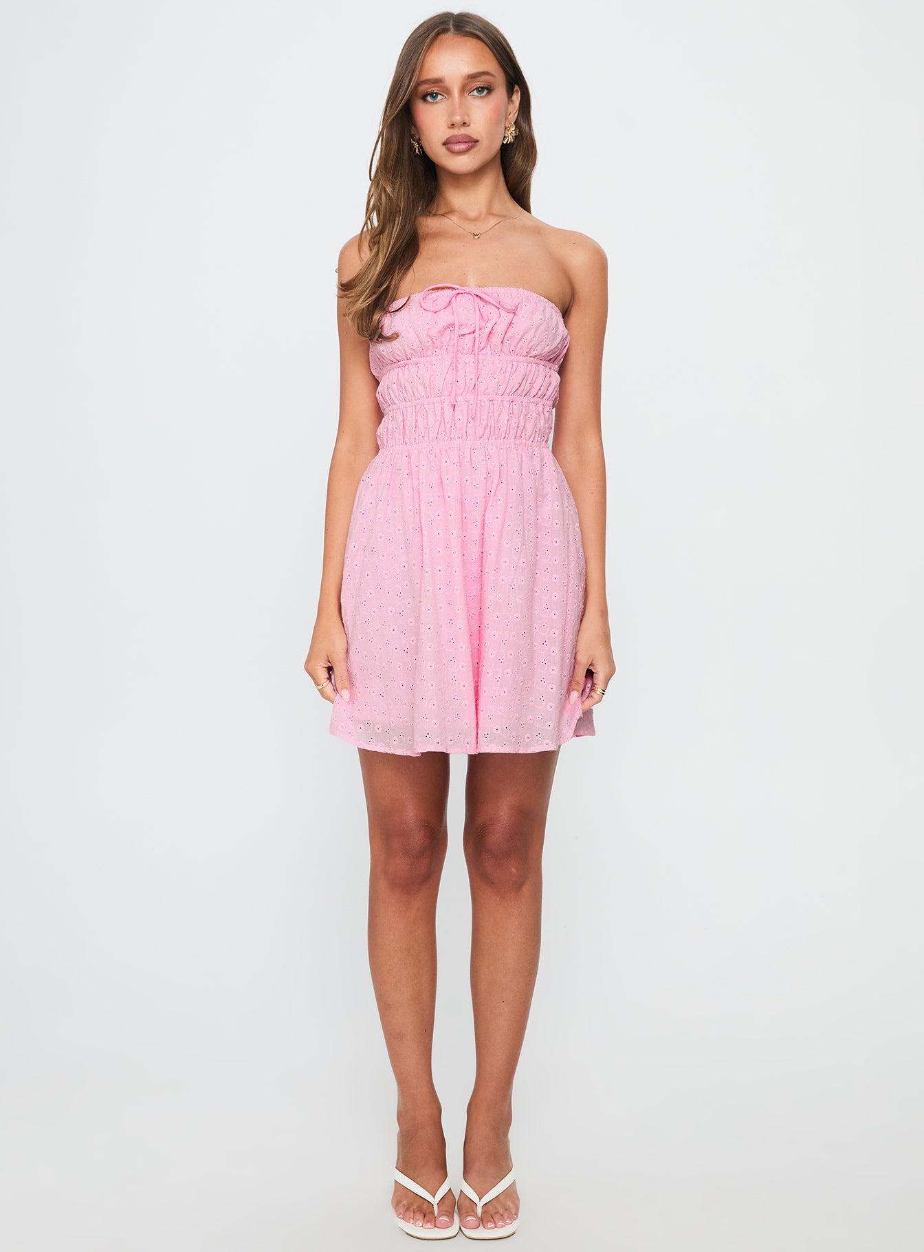 - Floral detail. front tie detail. elasticated bust. pleated hem