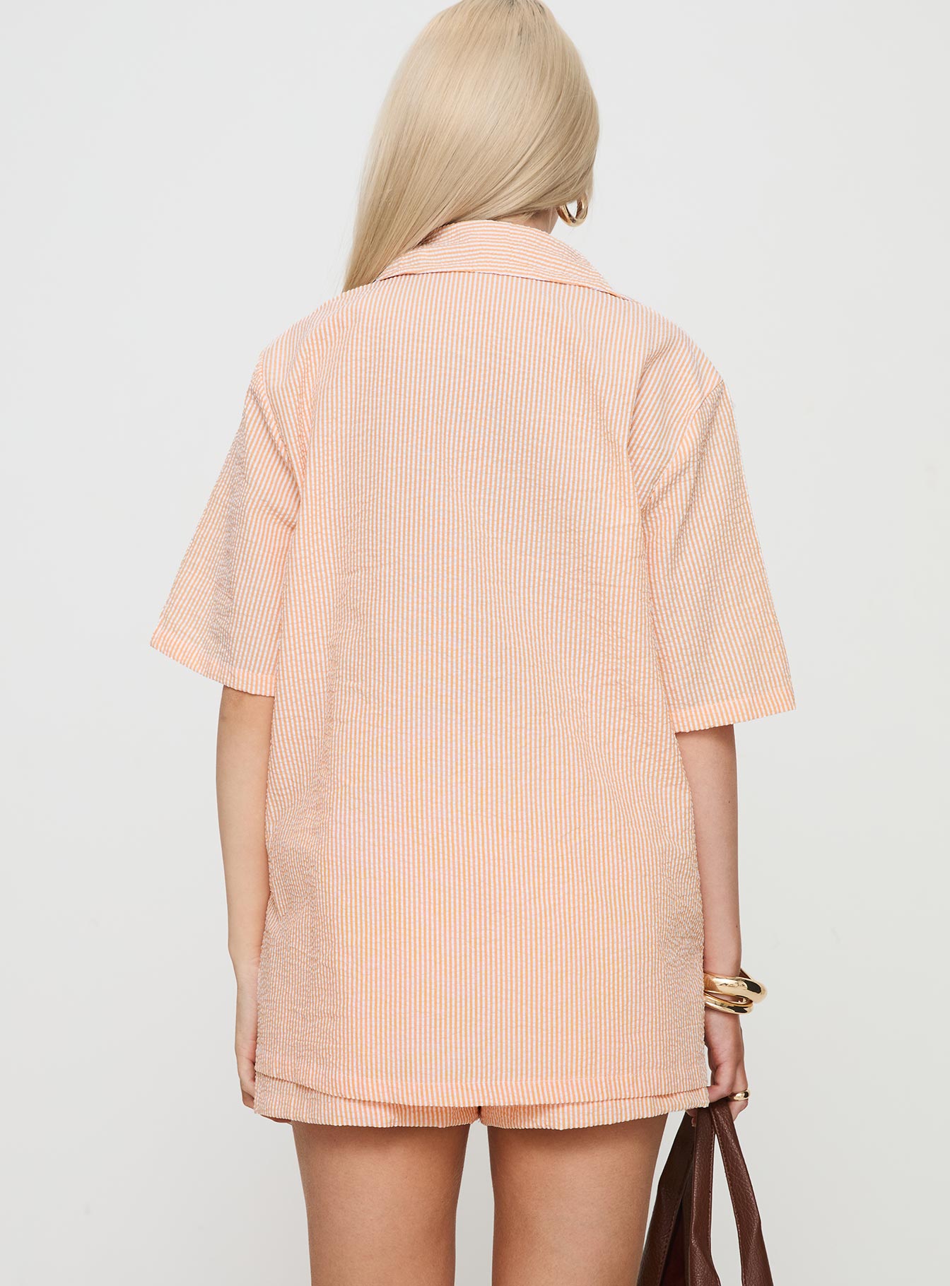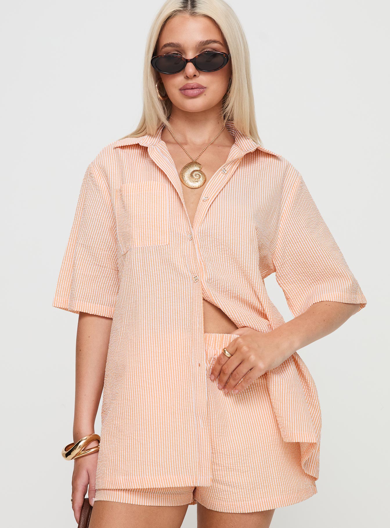 - Button-up top. collared. single breast pocket. oversized. mid-rise shorts. elasticated waistband