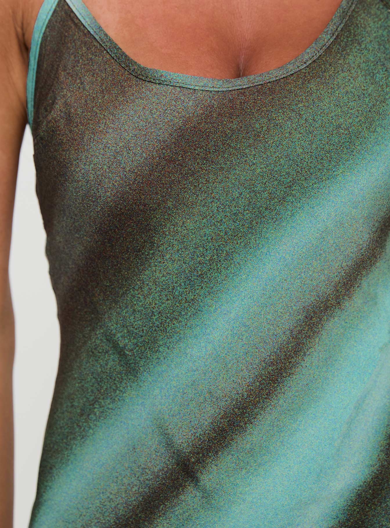 - Graphic print. sheer material. scoop neckline. tie fastenings at back