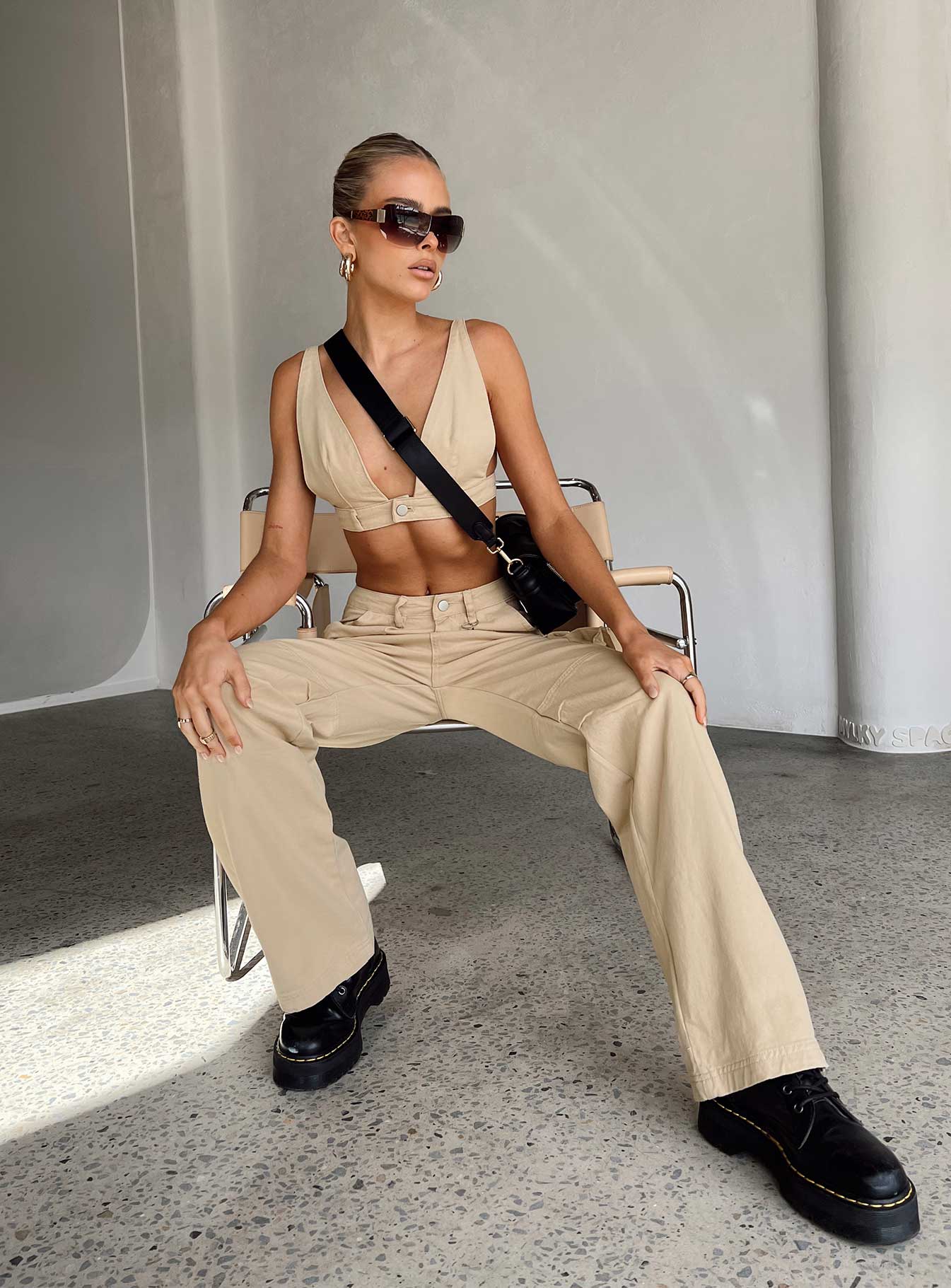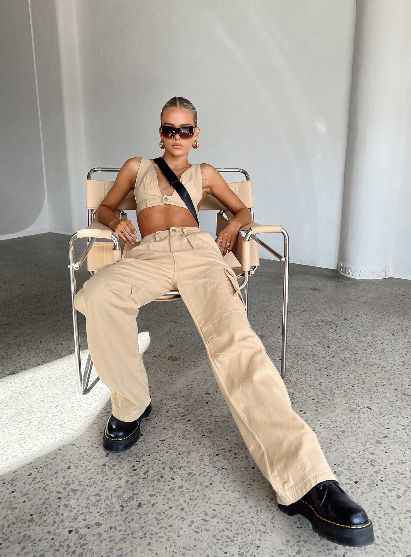 - Beige washed. belt looped waist. button & zip closure. cargo pockets. subtle pleats at waist