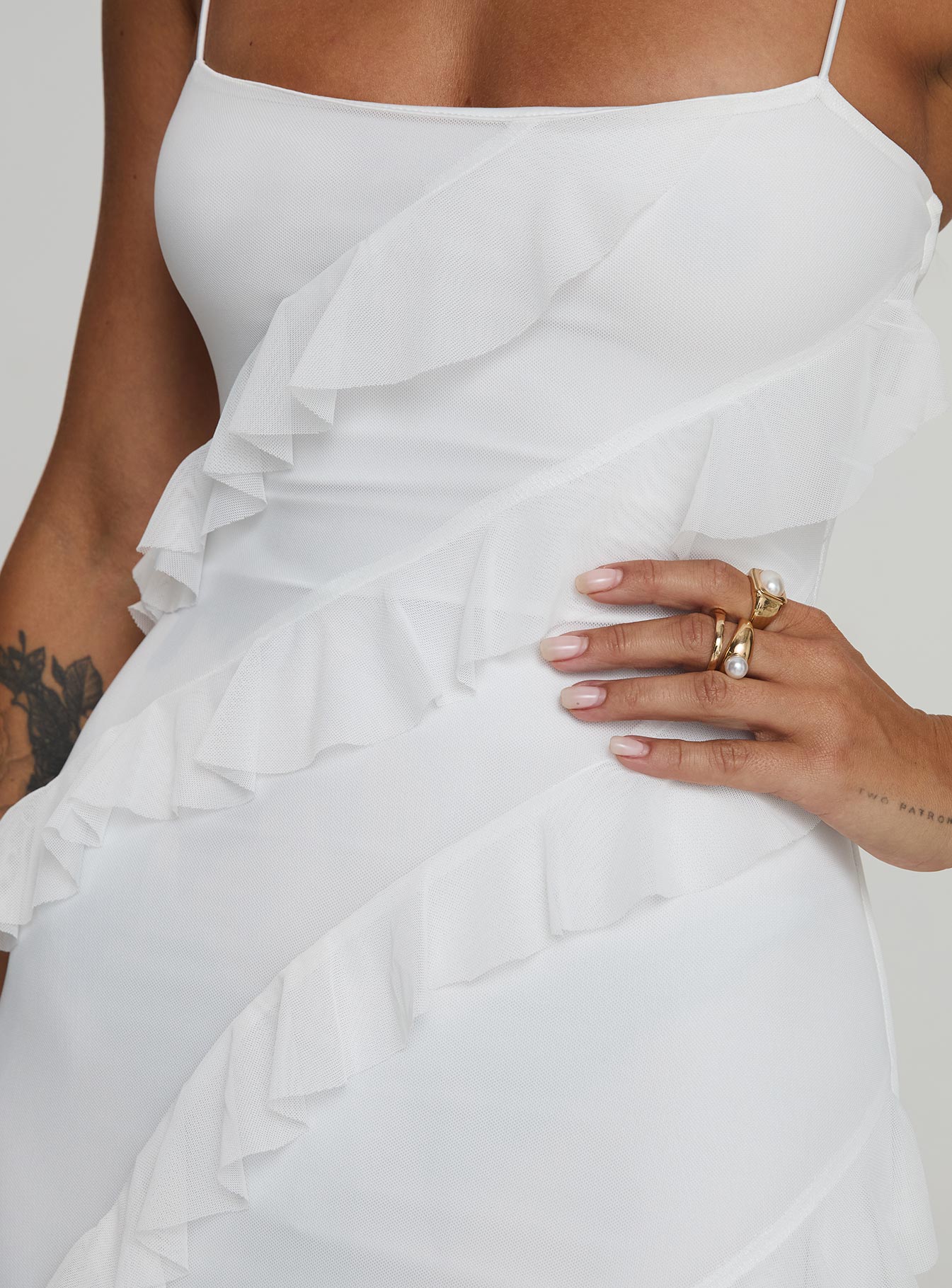 - Frill ruffle detail throughout. mesh material. fixed straps