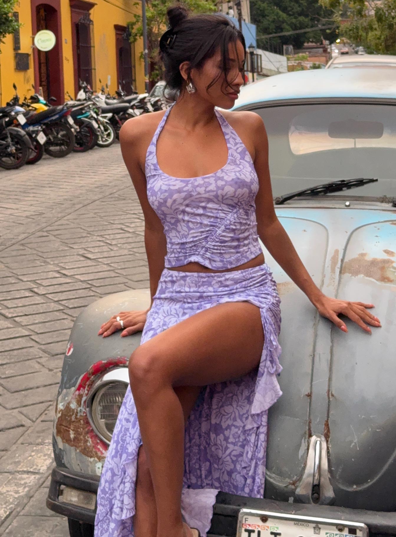 - Halter top. scoop neck. adjustable ruched detail. frill maxi skirt. elasticated waistband. side ruched with adjustable tie. split hem. mid-rise fit