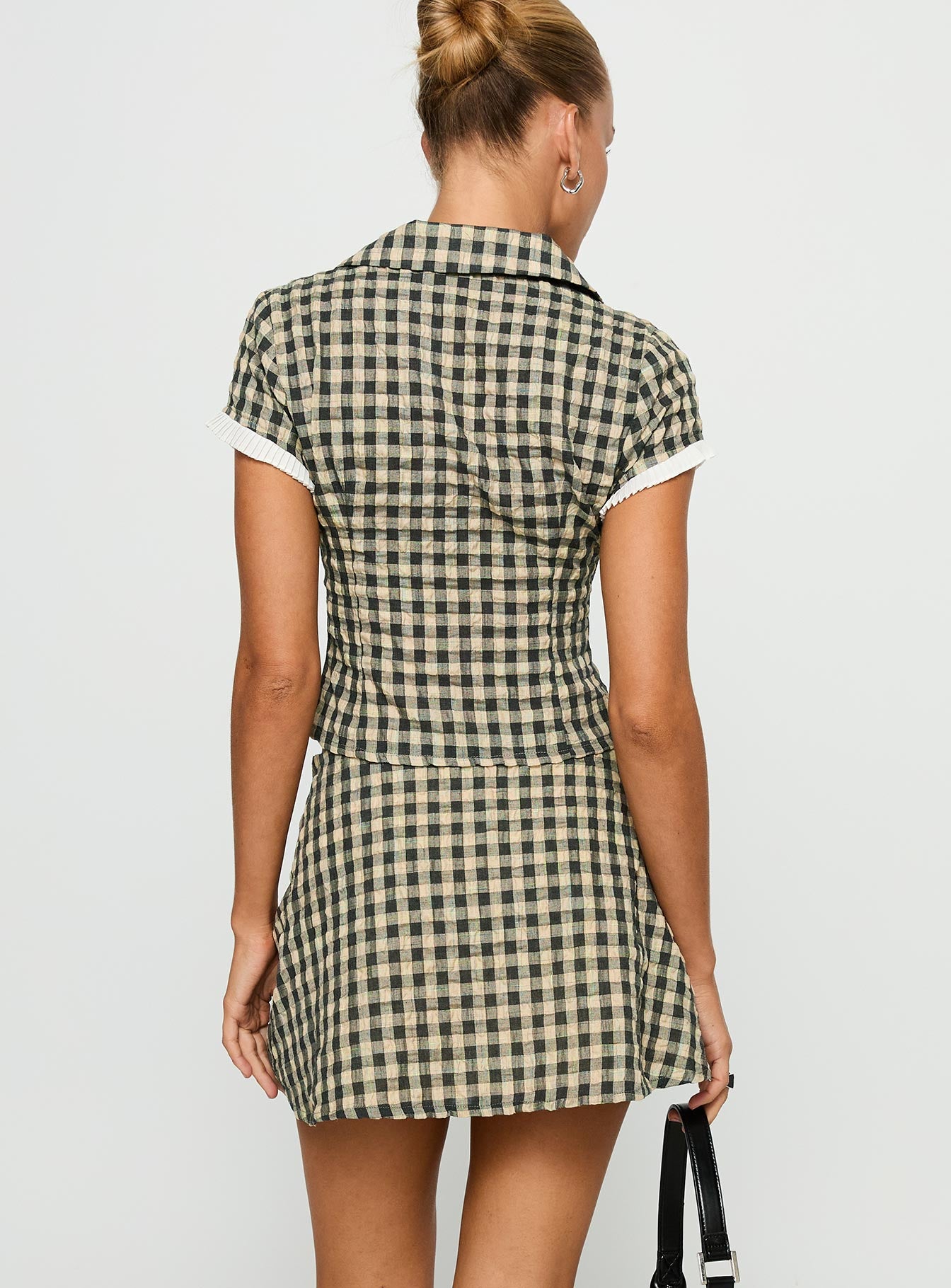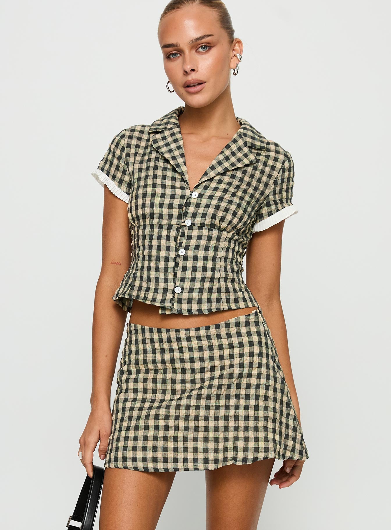 - Button up shirt. classic collar. cap sleeves with pleat detailing. invisible zip fastening at side. mini skirt. mid-rise fit