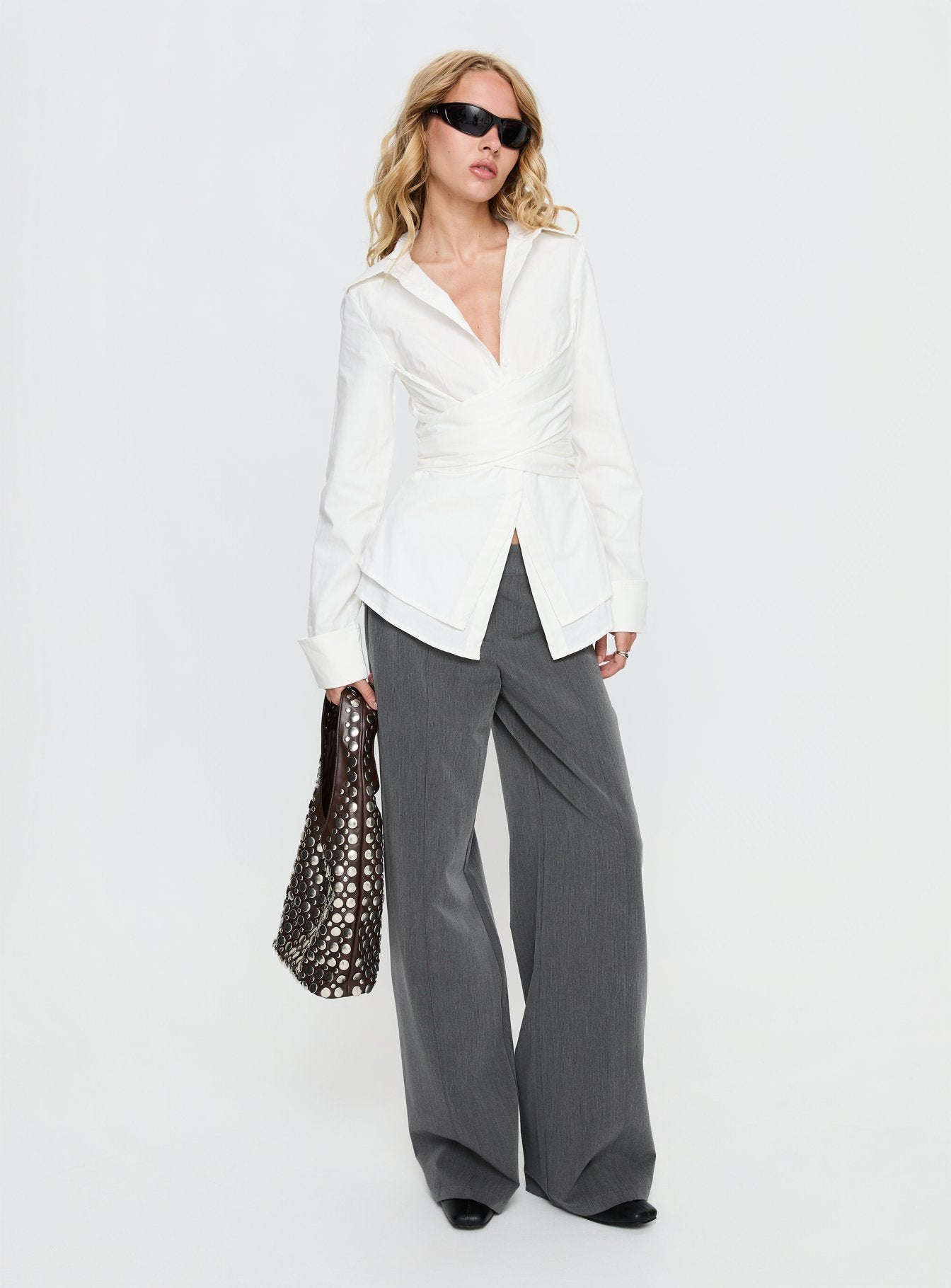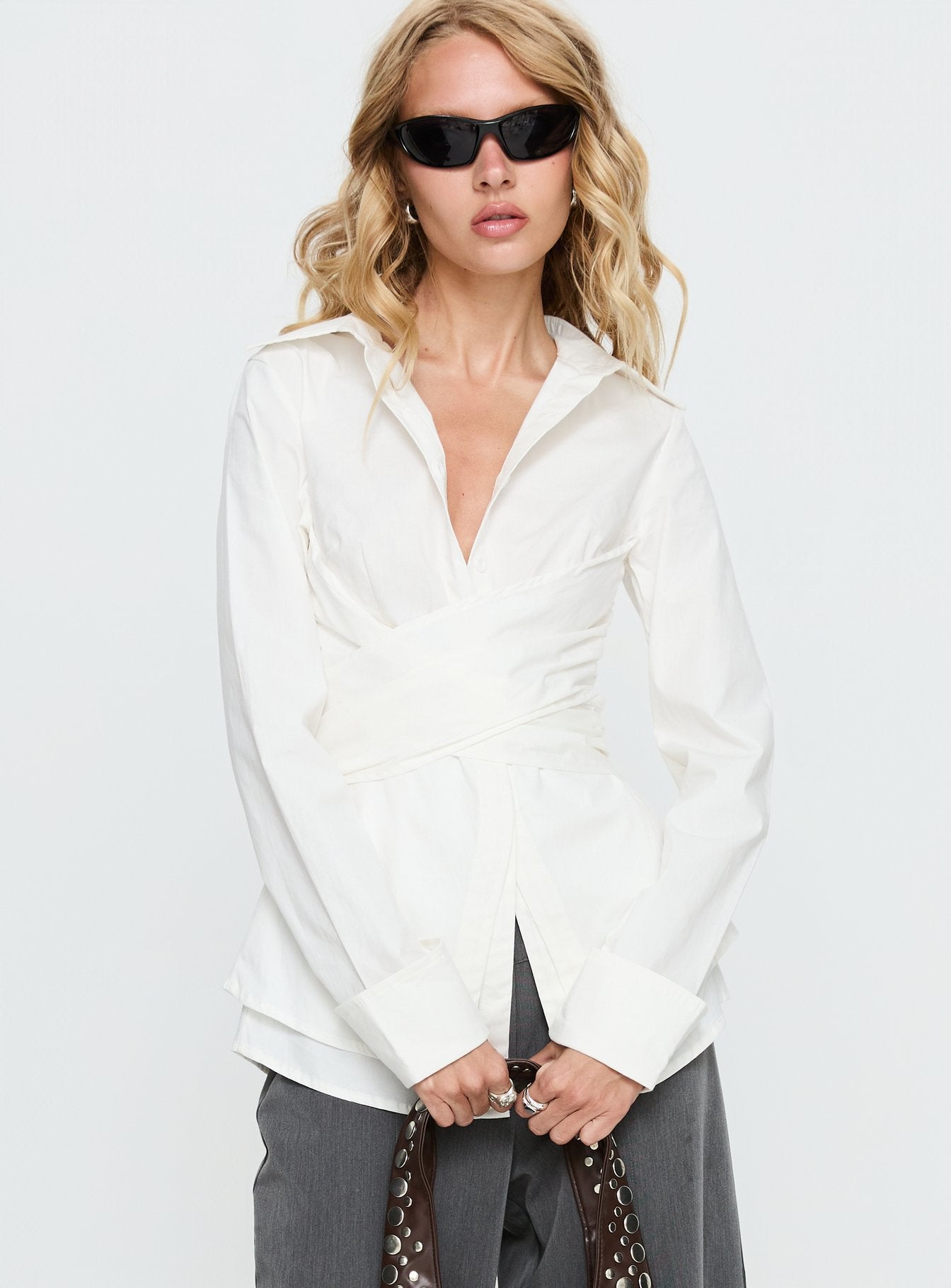 - Collared. button-up closure. tiered hem. cuffed sleeves