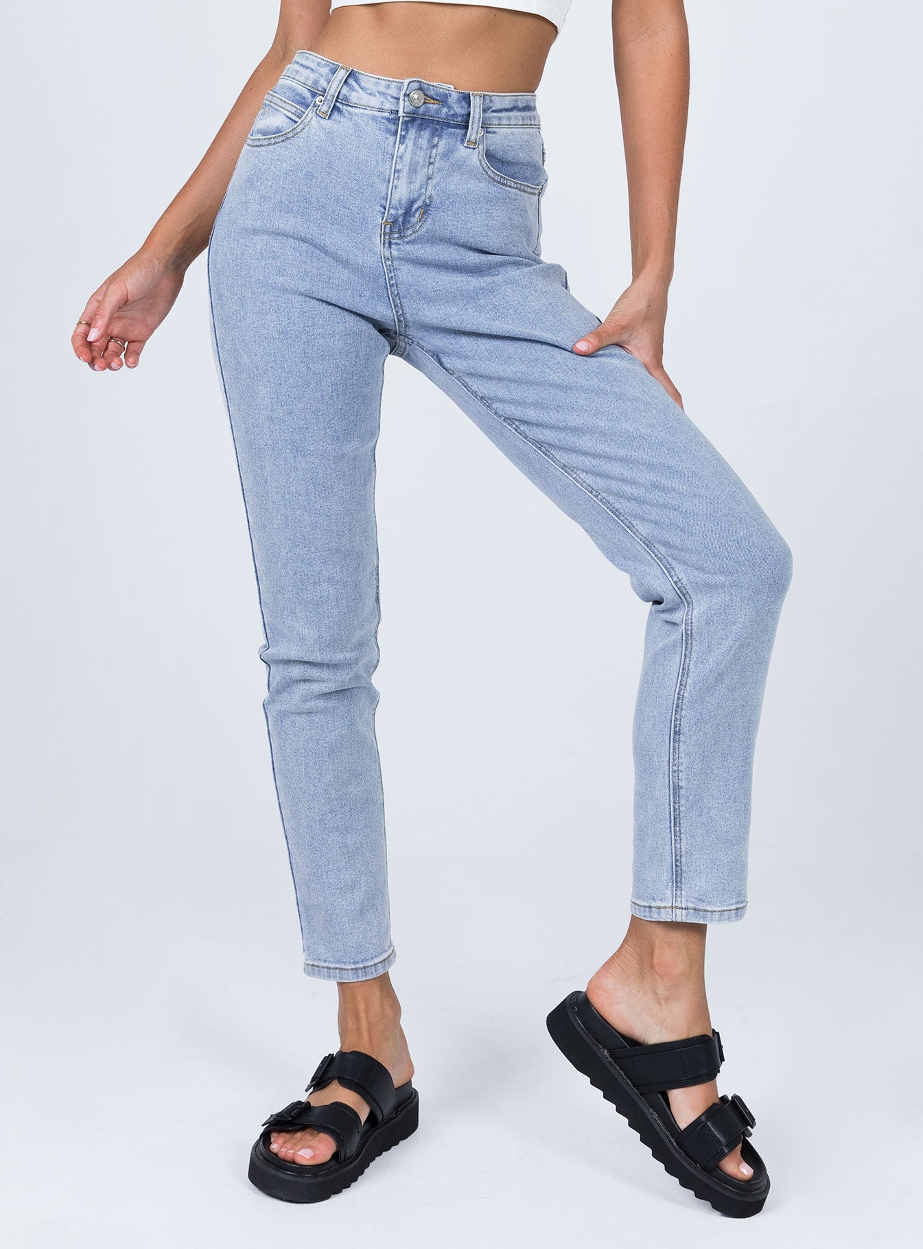 - Light washed. belt looped waist. button & zip closure. five pockets. branded patch at back. slim-fit