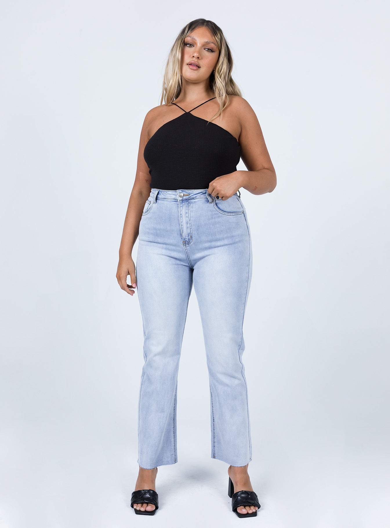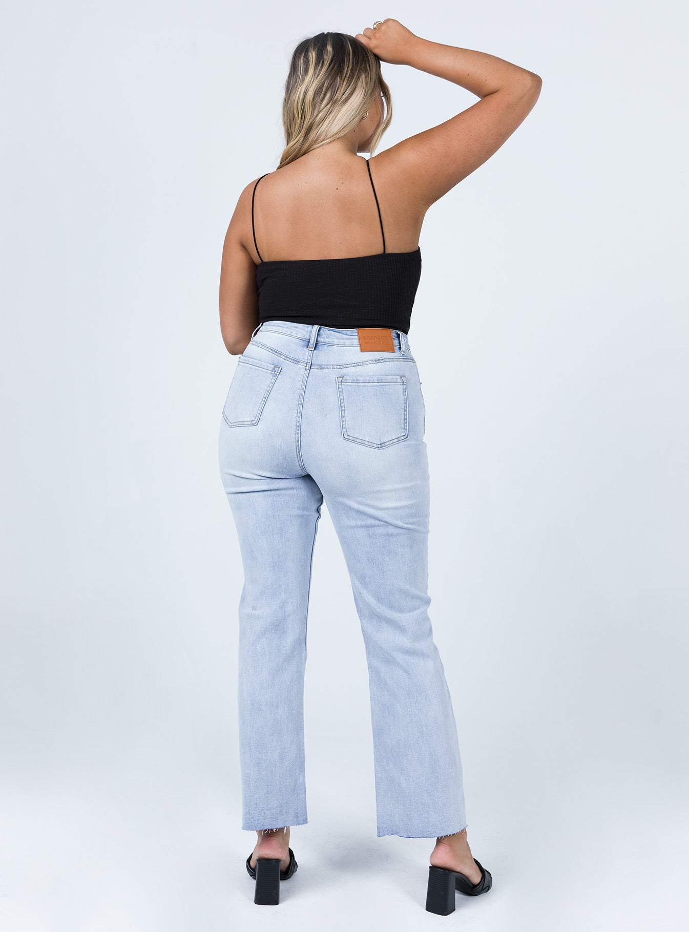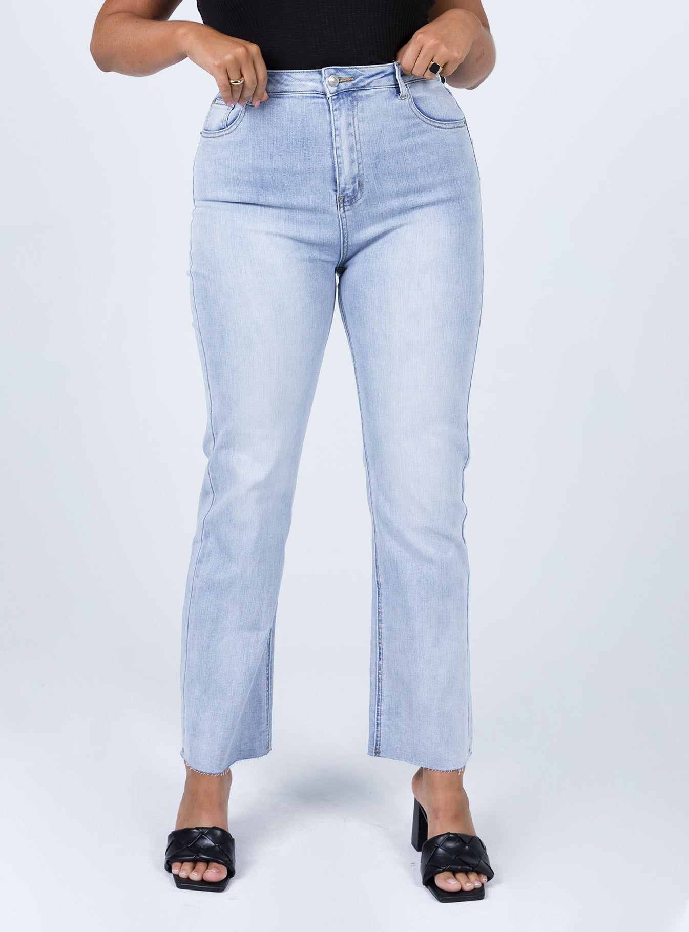 • Faded blue washed. belt looped waist. button & zip closure. five pockets. raw edge hem. branded patch at back. slim-fit