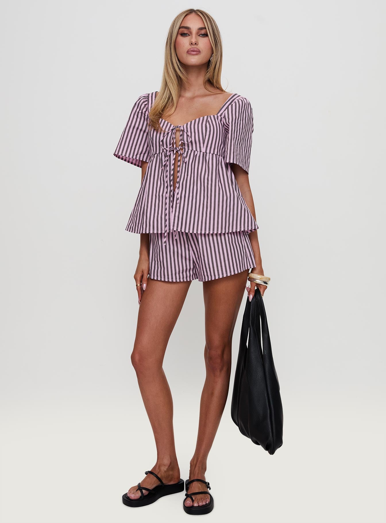 - Short sleeve top. double tie detail. split hem. cap sleeves. mid-rise shorts. elasticated waistband. mid-rise fit?