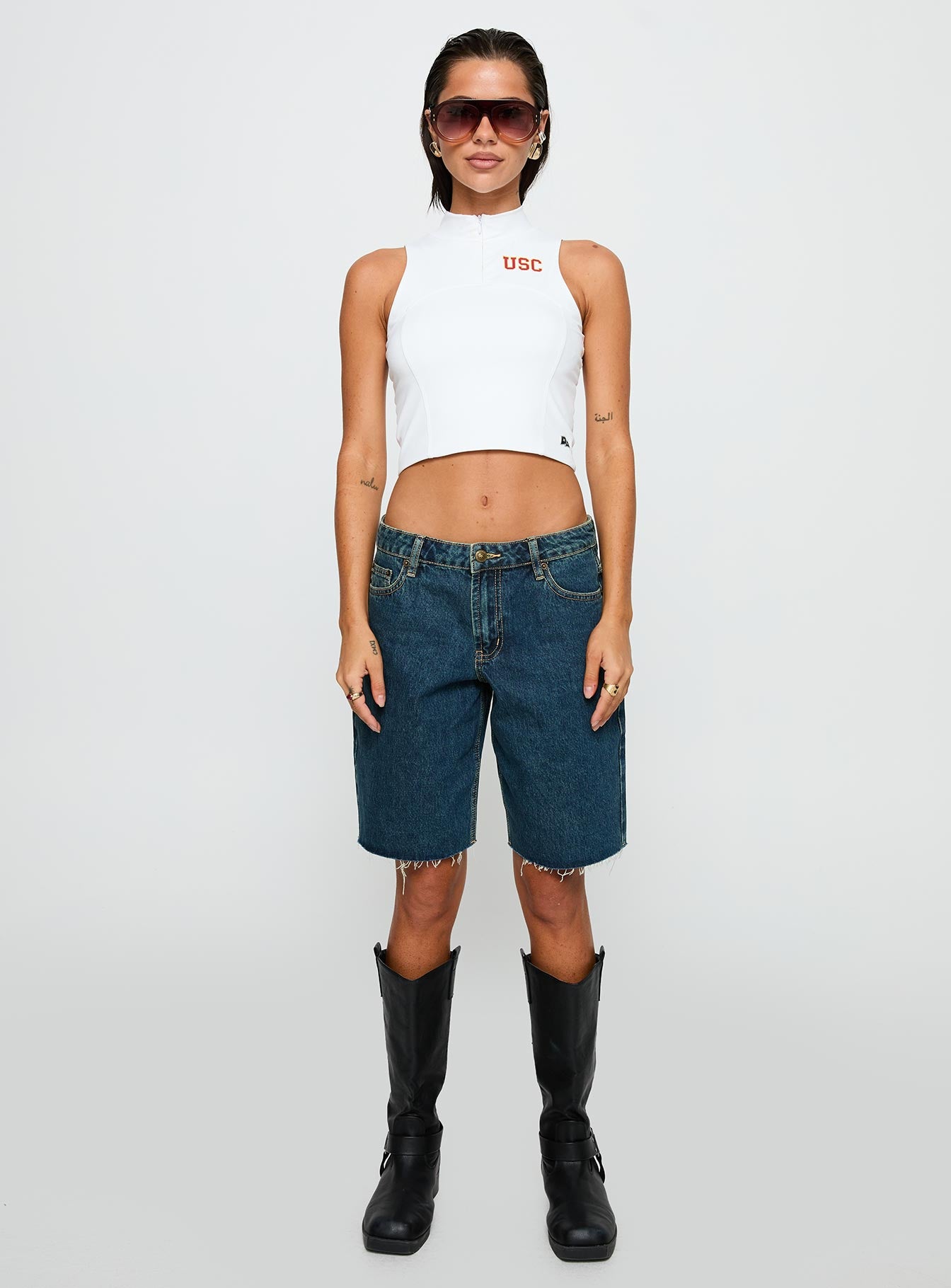 - USC print feature. high neck. zip closure. sleeveless. hype & vice brand detail at bottom hem. cropped-fit