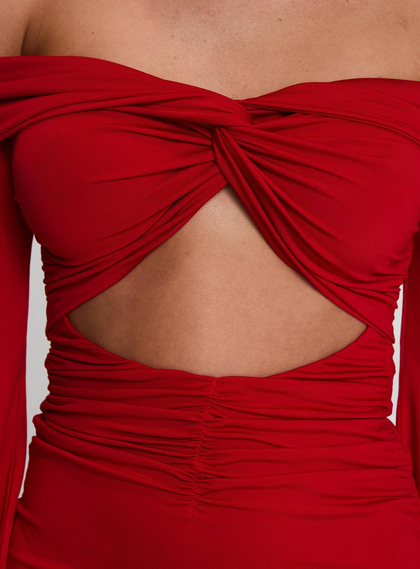 - Twisted-knot detail. ruched. cut-out at front. silicon strip. invisible zipper on side. flared cuffs