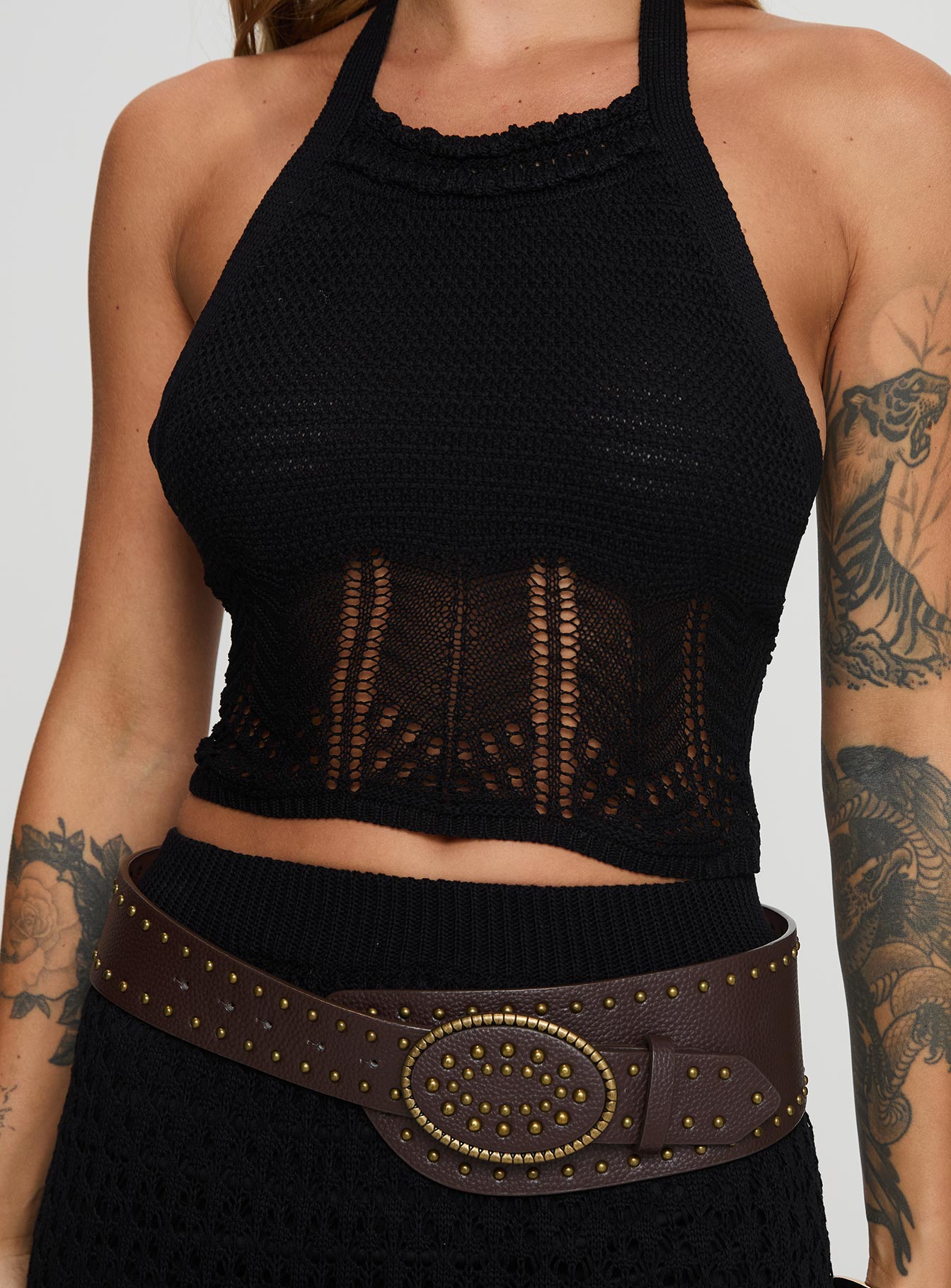 - Halter neck top. tie fastenings. exposed back. high neckline